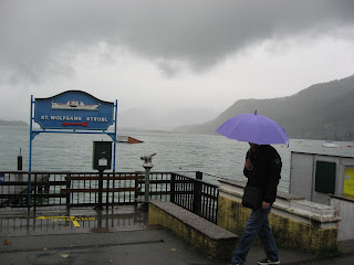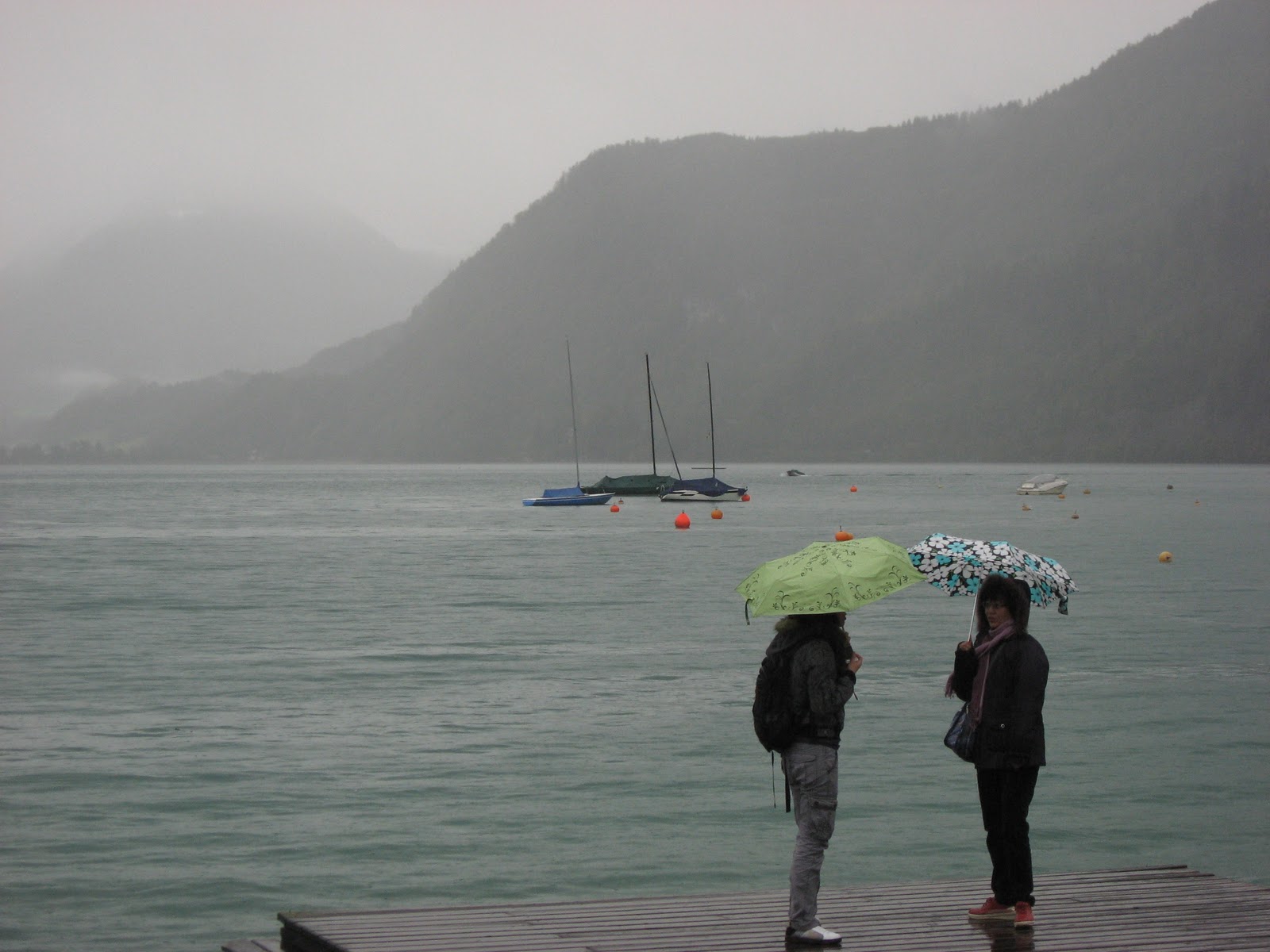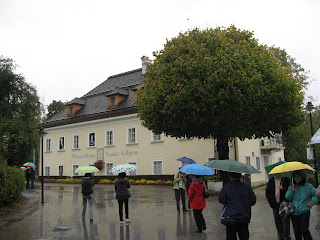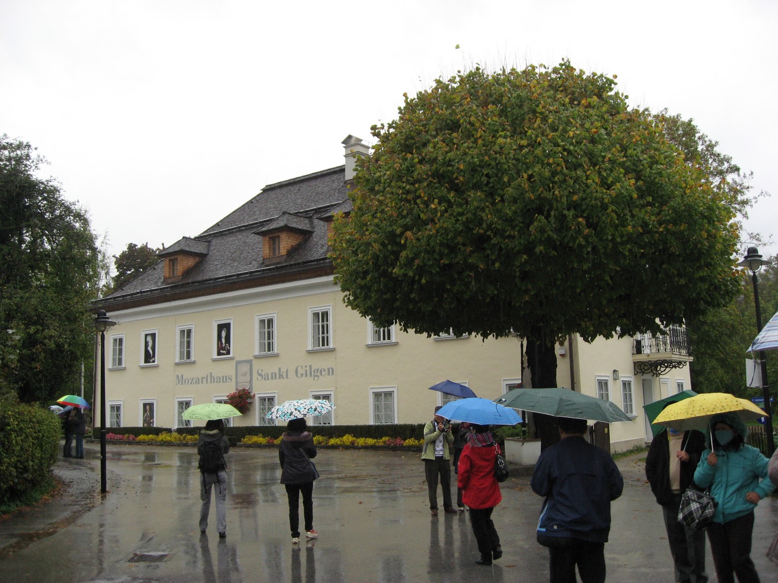 話說從山裡出來後,僅僅一日的好天氣,進入山中湖區,卻是漸漸漸冷。 這天一早,我們前往鹽湖區,本來要搭船的,但是氣候不佳船行不良,於是就不搭船漫遊鹽湖(我本來不想搭船,想逛小店。後來準備好要搭船的心情,卻又不能搭了)。到了鹽湖區,先去看看「莫札特他媽的家」,會變成這樣的句子,是因為我們美麗的導遊話說的太慢導致的笑點,後來也就這樣稱呼了。我們隨便拍了一張照就離開,去小店買了小長桌巾,跟可以當隔熱墊跟綁成盒子的容器(是同一個物品)。