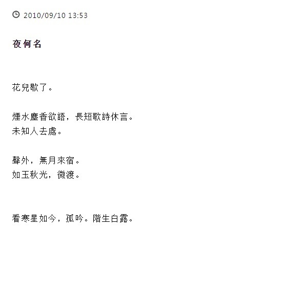 @宋代姜夔的《惜紅衣·簟枕邀涼》 簟枕邀涼,琴書換日,睡餘無力。細灑冰泉,並刀破甘碧。牆頭喚酒,誰問訊、城南詩客。岑寂,高柳晚蟬,說西風消息。 虹樑水陌,魚浪吹香,紅衣半狼藉。維舟試望,故國眇天北。可惜渚邊沙外,不共美人遊歷。問甚時同賦,三十六陂秋色? |