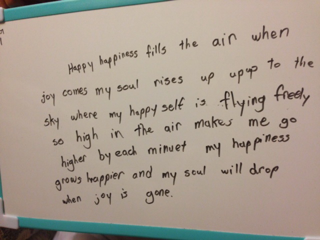 晨晨的即興詩/快樂 蒹葭 10/03/2014 前天晚上郁晨洗完澡躺在床上對著媽媽說:”Mom 我們來玩個遊戲吧!讓爸爸說一個字我們兩個來比賽把它寫成一首詩,好嗎?” 媽媽心想這麼棒的遊戲真是求之不得.就這樣短短半小時晨完成了11首詩.當然爸媽輸得很慘原因是要用英文寫.仔細品味她的詩,真是天馬行空的果然出自幼童純潔的心思與敏銳的觀察力.這當然也要歸功於愛看課外讀物所賜.不知她小小腦袋已經接收多少資訊? 媽媽決定不再懶散好好的借些版面介紹她的即興詩,一天一篇請期待. 媽媽問:”為什麼有些文法看起來怪怪的?”小姐說:”我們老師說寫詩的時候沒關係.” 謝謝冰冰姐送的小白板,晨晨超喜歡在上面塗鴉或寫字. 那天的題目有:Sky, Beach, Window, Rainy, Dance, Cry, Happy, Dark, iPad, Wind, Sculpture 就從快樂開始吧! 哦, 忘了介紹晨晨! 晨晨今年9歲了,最愛跳舞, 喜歡唱歌,也愛看書經常書不離手,去年榮獲全校閱讀課外書積分最高獎. 中文部分是由媽媽翻譯的哦! ~~~ Happy ~~~ Happy Happiness fills the air When joy comes my soul rises up up up to the sky where my happy self is flying freely so high in the air makes me go higher by each minute My happiness grows happier and my soul will drop when joy is gone 愉悅的快樂填滿每吋的空氣 當快樂的感覺來時 我的靈被提升推向高空 在高空中, 快樂它自己無拘無束地自由翱翔 我的心 分分秒秒地被帶往更高之處 我的愉悅 也隨著不斷加增 當快樂的感覺-----消失時 我的靈被拋下萬丈深坑