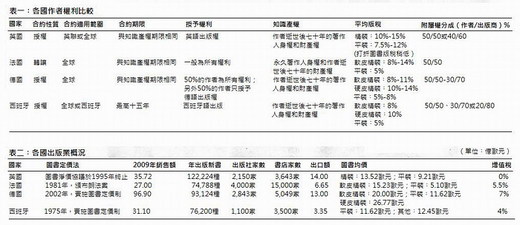 2010.11.8 出版商務週報/吳文婷 在英國,作者的版稅相對較高,但市場競爭較激烈,圖書打折幅度也較大。 近日,法國圖書與寫作調查機構Le MOTif公佈了其對英國、法國、德國和西班牙的作者權利的調查結果。這項調查為期一年,主要針對一般文學,約占上述國家出版業銷售額的1/4。50多位出版商、代理商、作者等接受了採訪。 調查顯示,這些國家的作者權利有所不同。例如,作者與出版商簽訂的合約期限不盡相同,在英國為作者去世後70年,在西班牙則為15年。在法國,作者的著作人身權與財產權分開,而這在德國是統一的。 英國與其他三國最大的不同之處在於其1995年廢除了圖書淨價協議,法國、德國和西班牙均有圖書定價法。另外,在英國,作者的版稅相對較高,但市場競爭較激烈,圖書打折幅度也較大(見表一)。 在數位出版方面,調查發現上述國家與美國不同,出版商與作者均持積極態度。