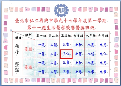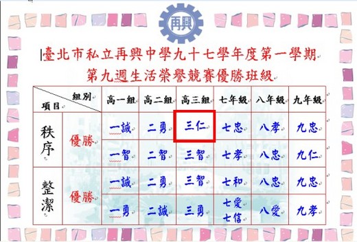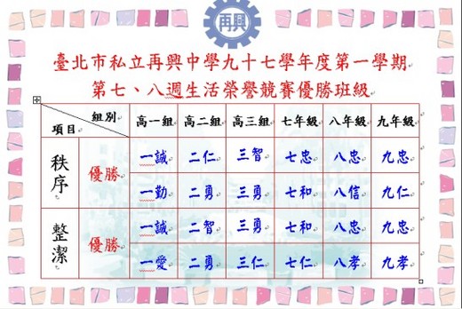 97學年度第一學期第7-8週 第9週 第10-11週生活榮譽競賽優勝