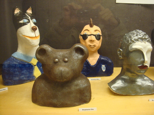 近日特別帶著相機又去一趟,當天陽光燦爛,是個氣溫宜人,讓人心情愉悅的日子,心中暗自期待櫥窗能有精彩的作品。到了學校,作品再度讓我驚訝,櫥窗以另一種面貌展現,雖沒有上回的實驗特性,不過作品極具可觀性。展出的陶藝作品,有色彩明亮的馬賽克陶板也有人物雕塑,人物造型大膽且逗趣可愛。