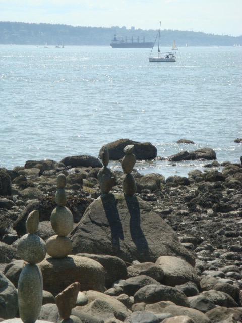 溫哥華English Bay海堤,時常見到海邊岩石上立著一串串由大小不等的石頭疊起的石柱。每回都讓我會心一笑,暗暗讚許遊客的創意,使得海邊生動了起來。其實,這些石柱都是一位疊石達人的傑作。