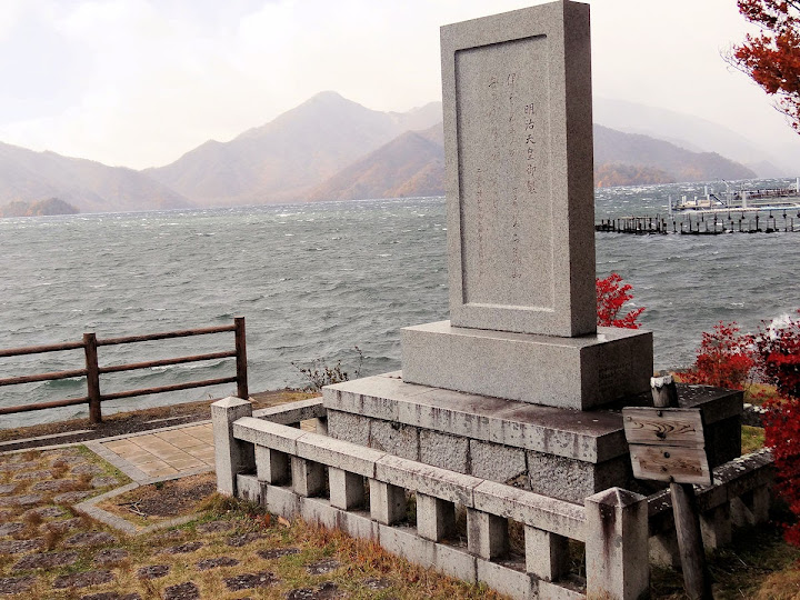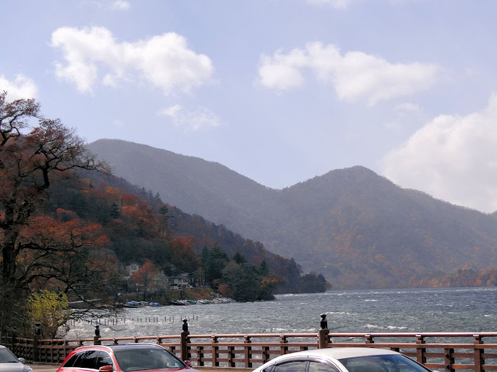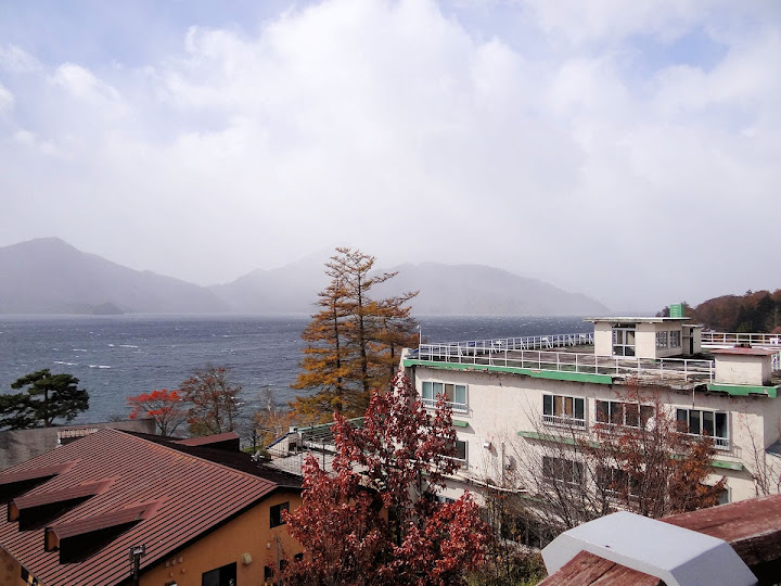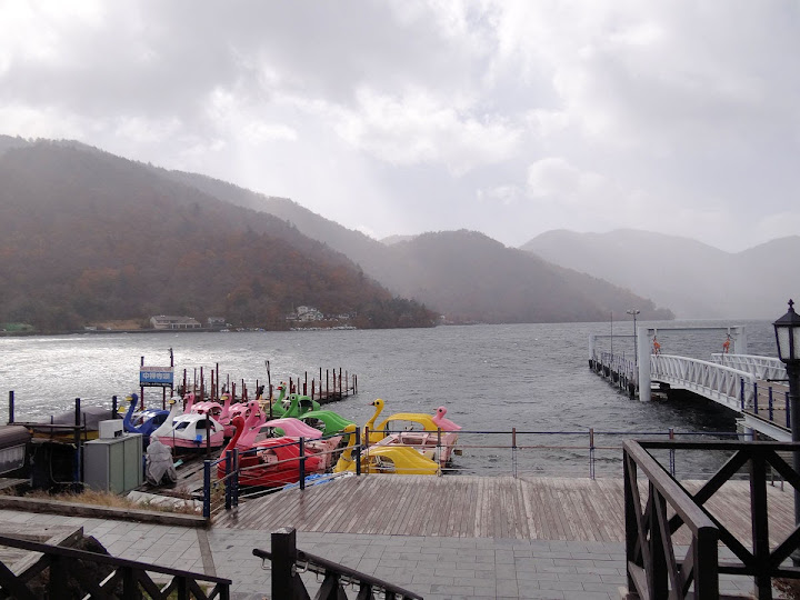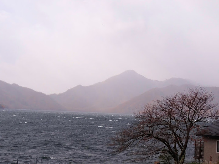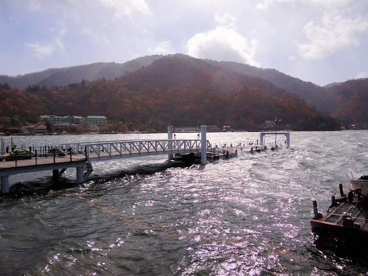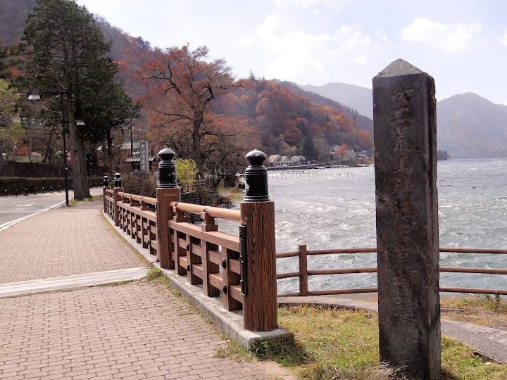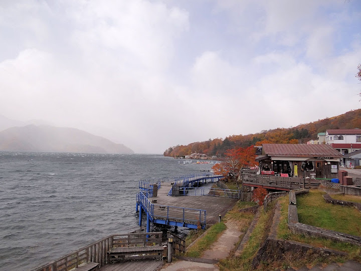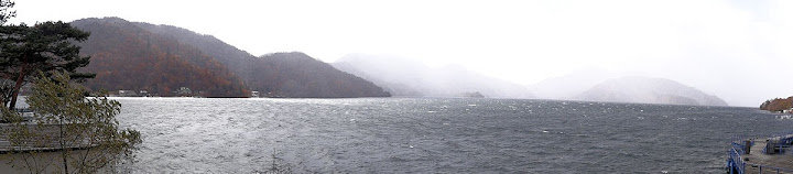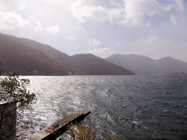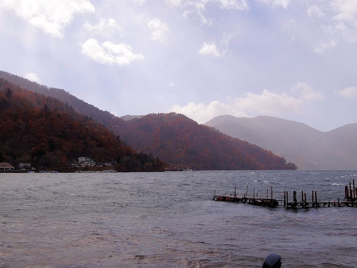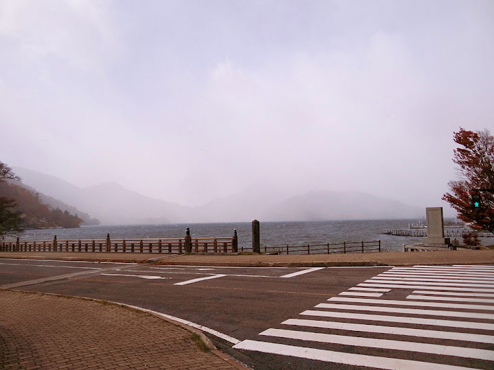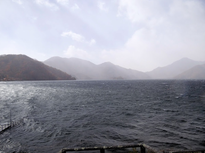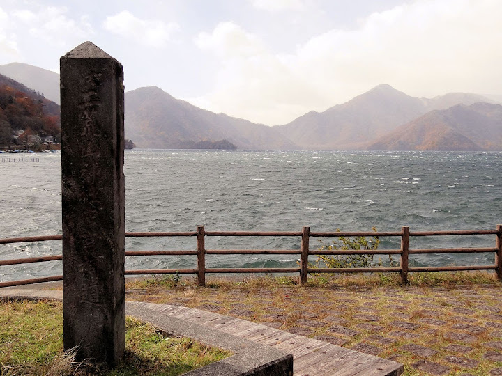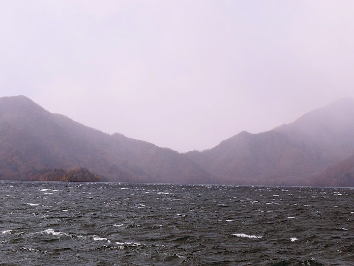 表定操課是:中禪寺溫泉駅下巴士,步行到碼頭,搭船遊湖一週,原地下船,再走到二荒山神社中宮祠,回頭到華嚴瀑布,然後下山。不料掃到颱風尾,挾帶冰霰的一場狂風打亂佈局,行程縮水成湖岸快閃。照片中白濛濛的並非雨水,而是細細的冰絲。由八到十級陣風推送,打在臉上不光是刺痛,連眼睛都睜不開。 由車站到碼頭不過三百公尺,頂風卻寸步難行,走了近廿分鐘。其實下車那一瞬間便知遊船無望,卻總要親眼目睹方才死心。何況起初還抱一線希望,陸上的中宮祠總該去得成。逆風又走兩、三百米,風勢只有愈來愈強,終於覺得老命要緊,服輸撤退。回程讓風推著,可愉快了,不一會兒就飄到華嚴瀑布附近的日光自然博物館,倚仗地形地物掩護,不再一路挨刮。 華嚴瀑布留到下一篇。頂風走回車站依然痛苦,特別是人同此心,發覺中禪寺湖沒搞頭而想下山的人大排長龍。候車亭之間無遮棚處,排隊的人就苦了,不斷受冰旋風轟擊,站著不動特別難捱。好不容易巴士進站,都是儘可能擠上車,成了沙丁魚罐頭。唯一可資慶幸的是,中禪寺溫泉駅是半數巴士的起站,再擠總也上得了;第二站開始,就完全沒機會囉。