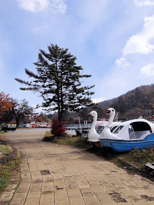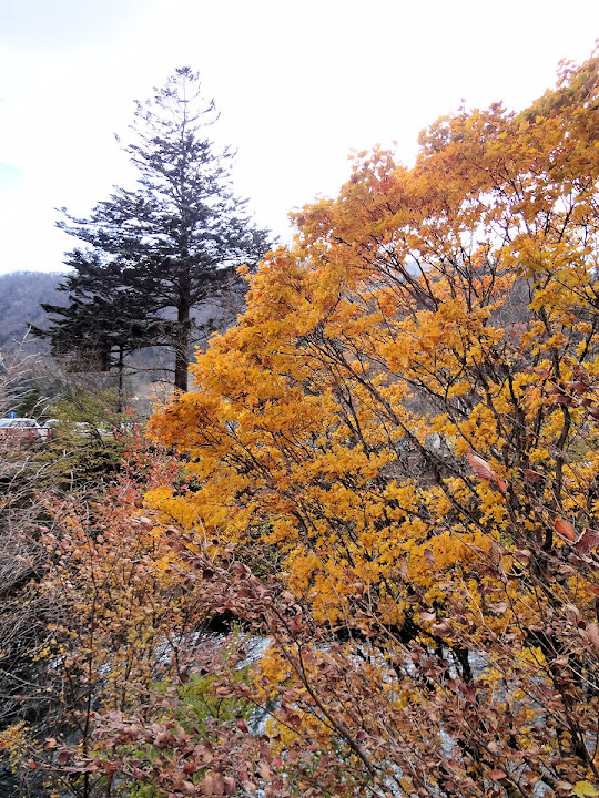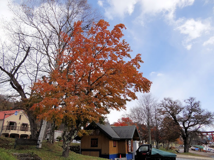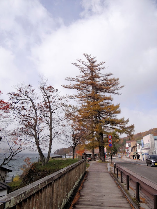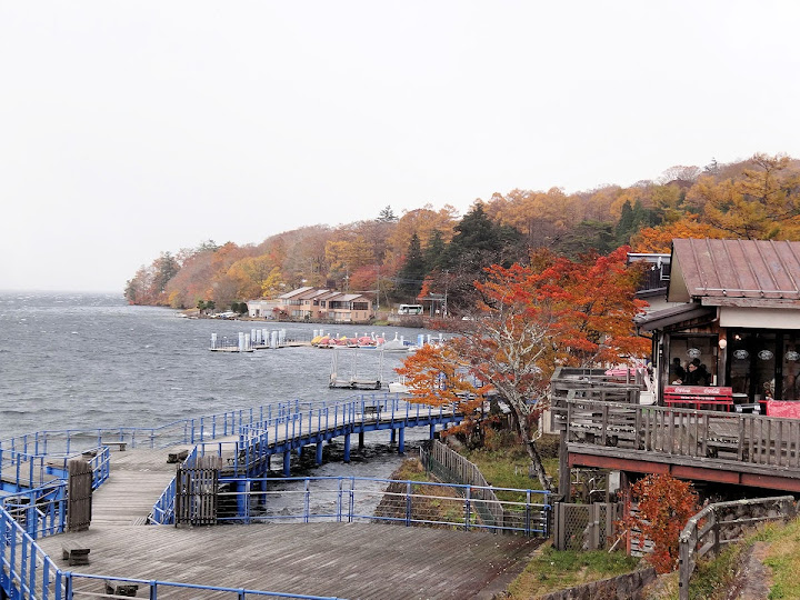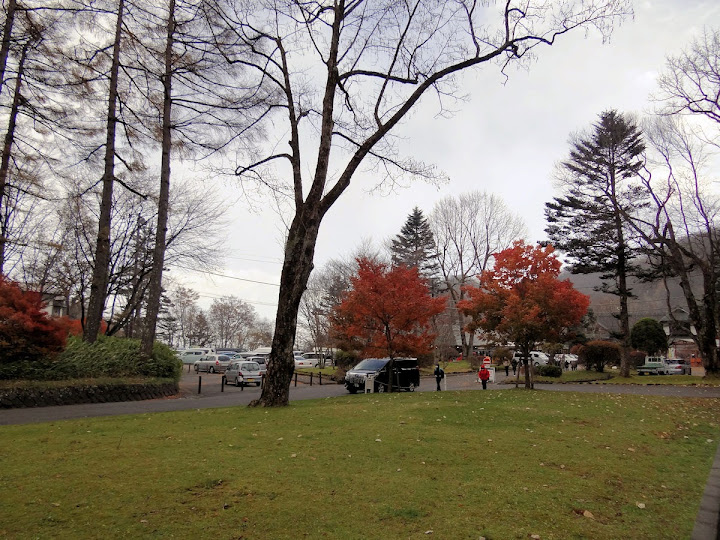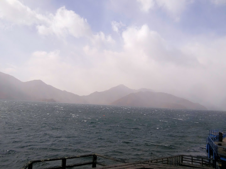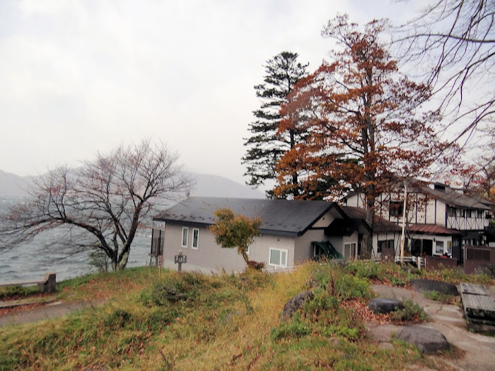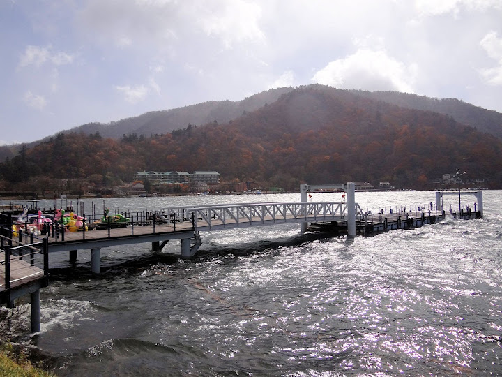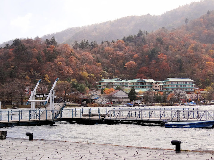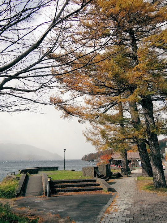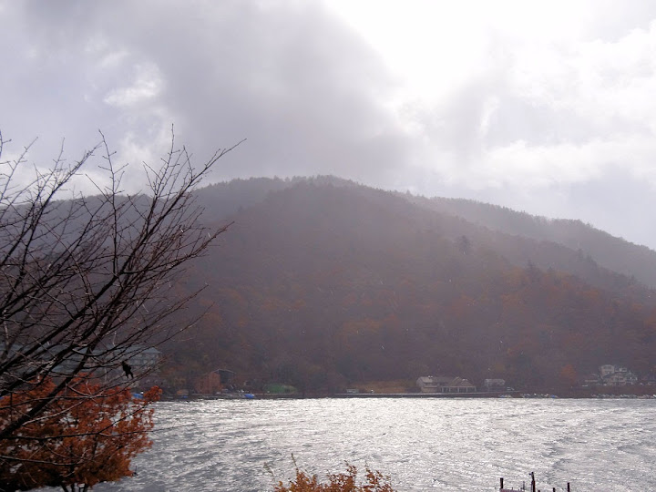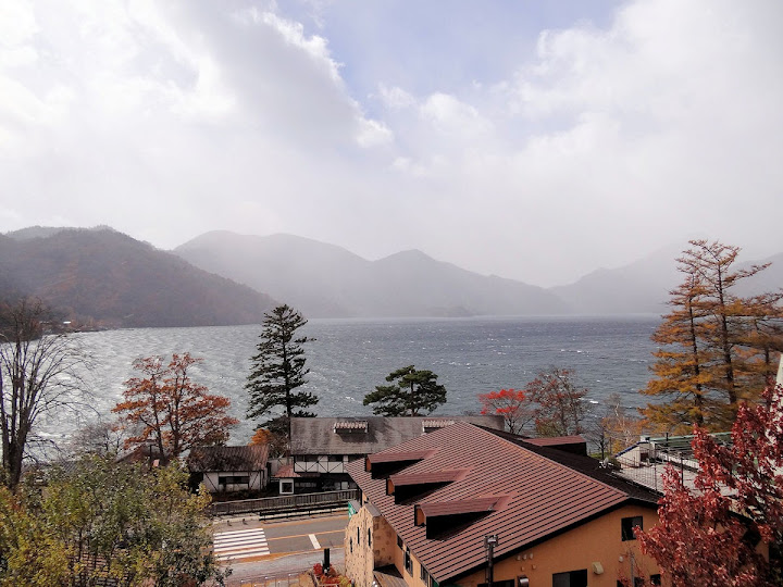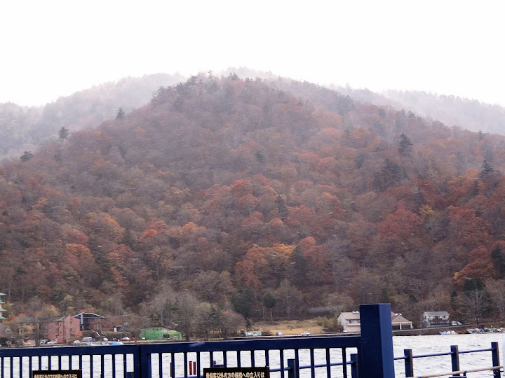 表定操課是:中禪寺溫泉駅下巴士,步行到碼頭,搭船遊湖一週,原地下船,再走到二荒山神社中宮祠,回頭到華嚴瀑布,然後下山。不料掃到颱風尾,挾帶冰霰的一場狂風打亂佈局,行程縮水成湖岸快閃。照片中白濛濛的並非雨水,而是細細的冰絲。由八到十級陣風推送,打在臉上不光是刺痛,連眼睛都睜不開。 由車站到碼頭不過三百公尺,頂風卻寸步難行,走了近廿分鐘。其實下車那一瞬間便知遊船無望,卻總要親眼目睹方才死心。何況起初還抱一線希望,陸上的中宮祠總該去得成。逆風又走兩、三百米,風勢只有愈來愈強,終於覺得老命要緊,服輸撤退。回程讓風推著,可愉快了,不一會兒就飄到華嚴瀑布附近的日光自然博物館,倚仗地形地物掩護,不再一路挨刮。 華嚴瀑布留到下一篇。頂風走回車站依然痛苦,特別是人同此心,發覺中禪寺湖沒搞頭而想下山的人大排長龍。候車亭之間無遮棚處,排隊的人就苦了,不斷受冰旋風轟擊,站著不動特別難捱。好不容易巴士進站,都是儘可能擠上車,成了沙丁魚罐頭。唯一可資慶幸的是,中禪寺溫泉駅是半數巴士的起站,再擠總也上得了;第二站開始,就完全沒機會囉。
