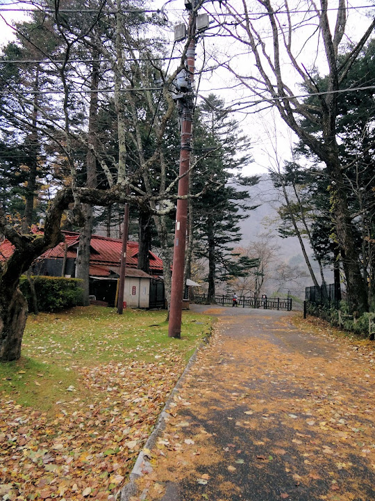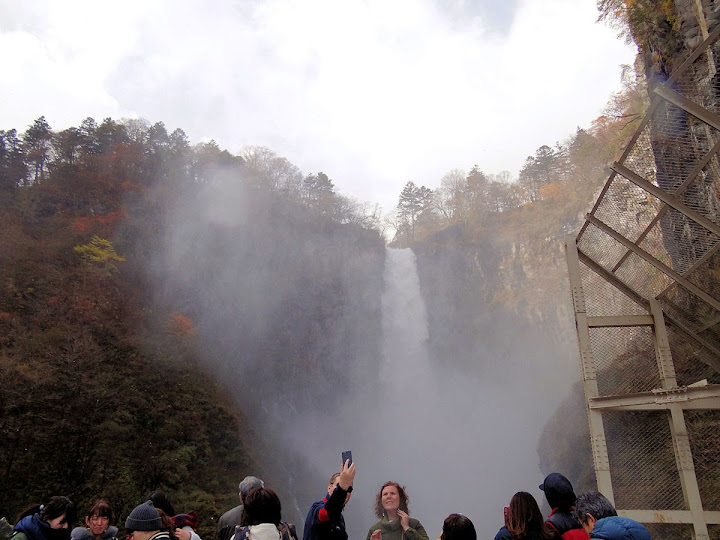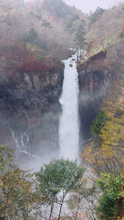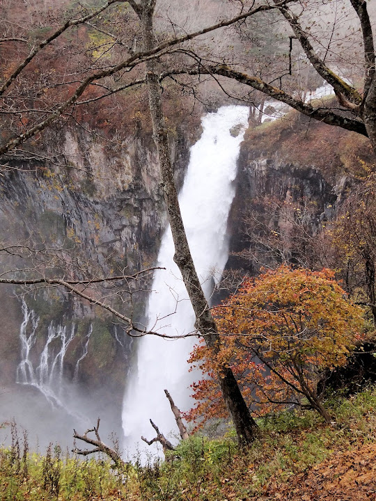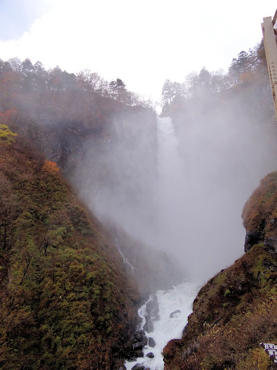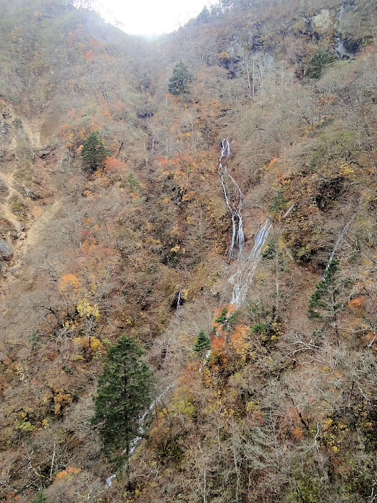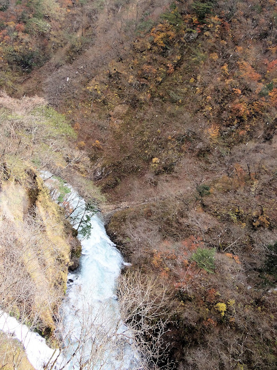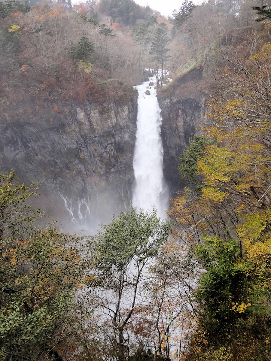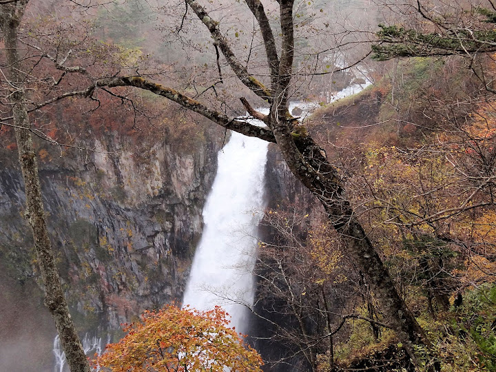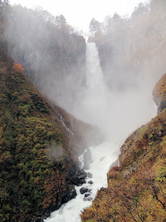原做為中禪寺湖最後一站,因為頂不過大風,提早被推送到此地。華嚴瀑布落差近一百米,除了名頭最響亮的「日本三名瀑」之外,什麼日光三名瀑、奥日光三名瀑,也都少不了一份。四季景致不同,秋天紅葉之外,冬季更可觀賞冰瀑。至於秋冬之交呢,有點尷尬,那便是本文了。不過瀑底仰望的氣勢倒是不變,開頭幾張圖片,是搭乘電梯垂降到谷底的下觀景台所拍,先體會一下氣場。 有下觀景台,自然便有上觀景台。後者由中禪寺溫泉駅步行五分鐘即到,大風推送更快。上下觀景台之間據說原本有步道,然而一則因為谷地岩壁由男體山噴發物形成,結構鬆散,有安全疑慮;二則雖然附近大小瀑布的名稱都出自佛經,乃佛教聖地,但同時也是日本的自殺勝地,當局有意防範;最後,近卅層樓的高低差,也不是一般老弱婦孺能夠輕易達陣的。因此在兩個觀景台之間設有電梯,花個550日圓(時價請看官網)便可去回。對趕時間的遊客,更是何樂不為。