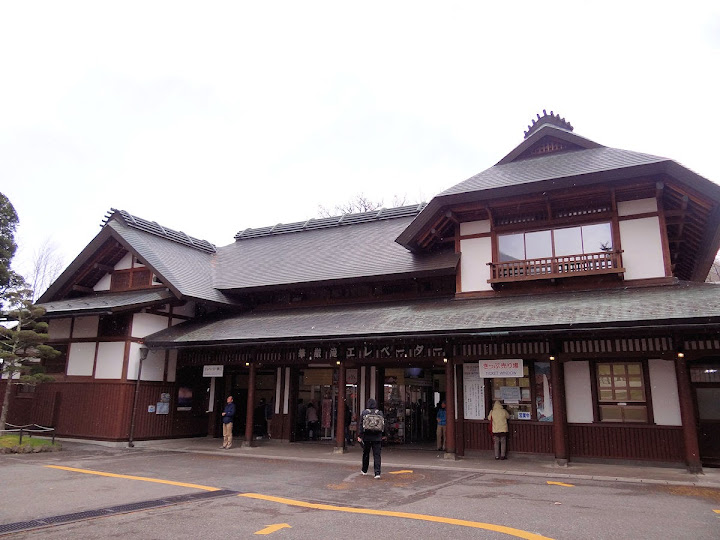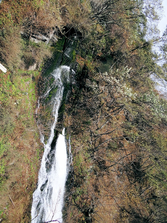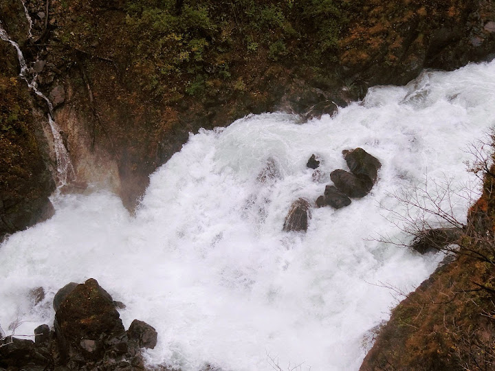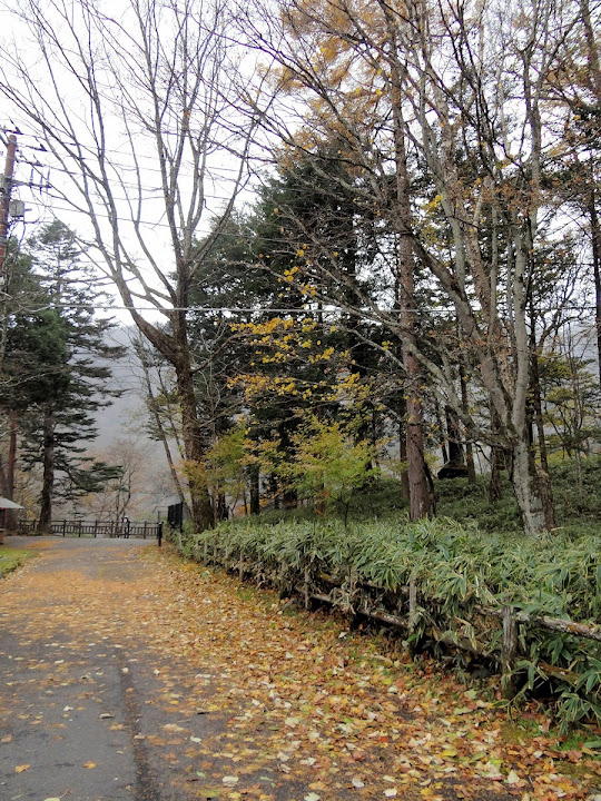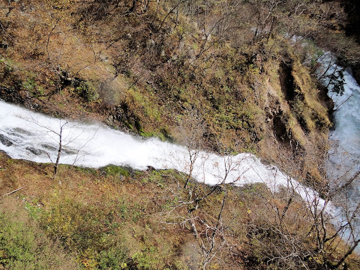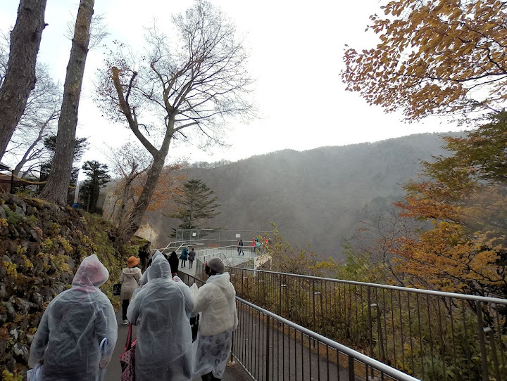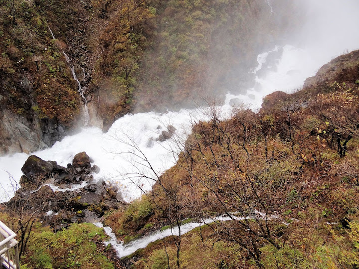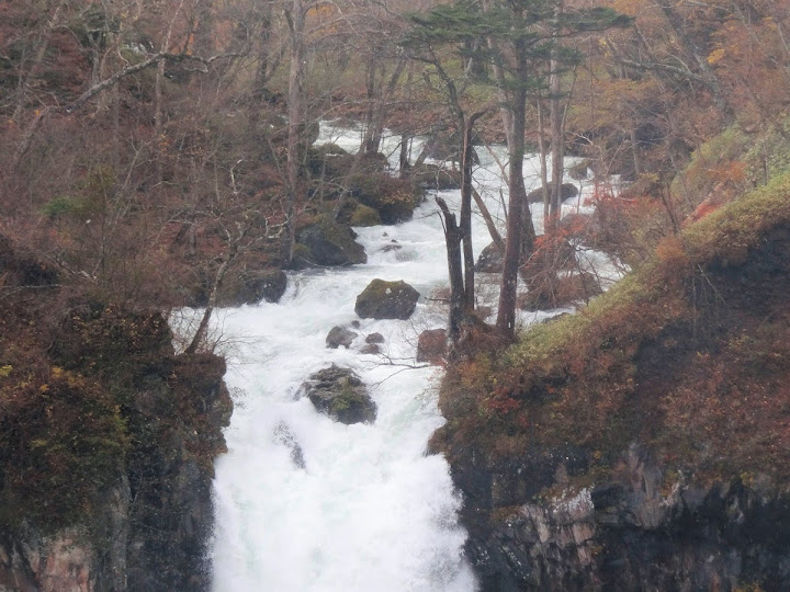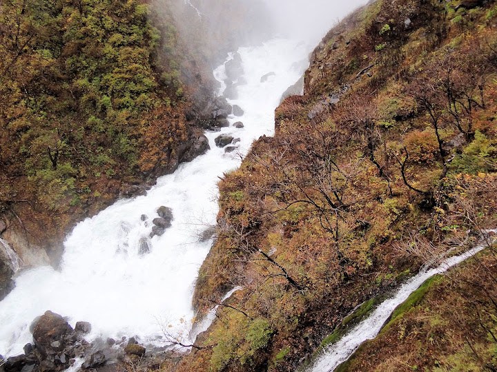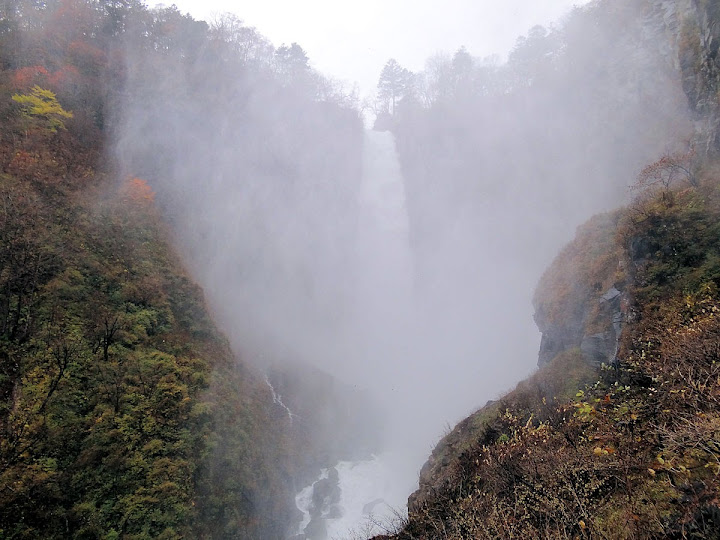 原做為中禪寺湖最後一站,因為頂不過大風,提早被推送到此地。華嚴瀑布落差近一百米,除了名頭最響亮的「日本三名瀑」之外,什麼日光三名瀑、奥日光三名瀑,也都少不了一份。四季景致不同,秋天紅葉之外,冬季更可觀賞冰瀑。至於秋冬之交呢,有點尷尬,那便是本文了。不過瀑底仰望的氣勢倒是不變,開頭幾張圖片,是搭乘電梯垂降到谷底的下觀景台所拍,先體會一下氣場。 有下觀景台,自然便有上觀景台。後者由中禪寺溫泉駅步行五分鐘即到,大風推送更快。上下觀景台之間據說原本有步道,然而一則因為谷地岩壁由男體山噴發物形成,結構鬆散,有安全疑慮;二則雖然附近大小瀑布的名稱都出自佛經,乃佛教聖地,但同時也是日本的自殺勝地,當局有意防範;最後,近卅層樓的高低差,也不是一般老弱婦孺能夠輕易達陣的。因此在兩個觀景台之間設有電梯,花個550日圓(時價請看官網)便可去回。對趕時間的遊客,更是何樂不為。