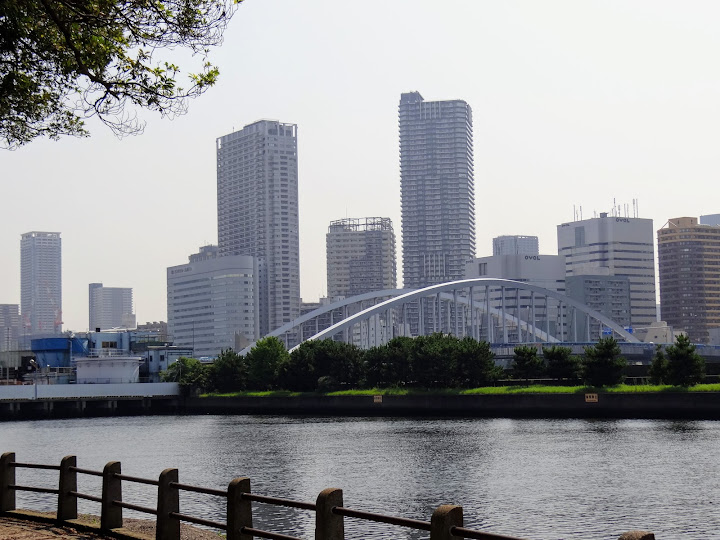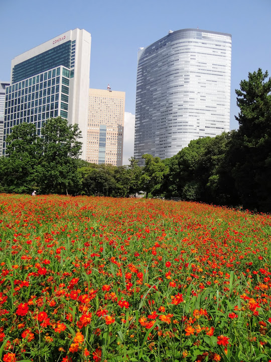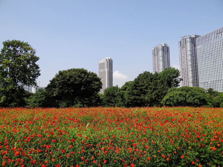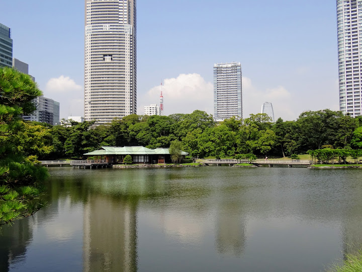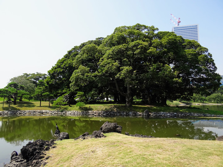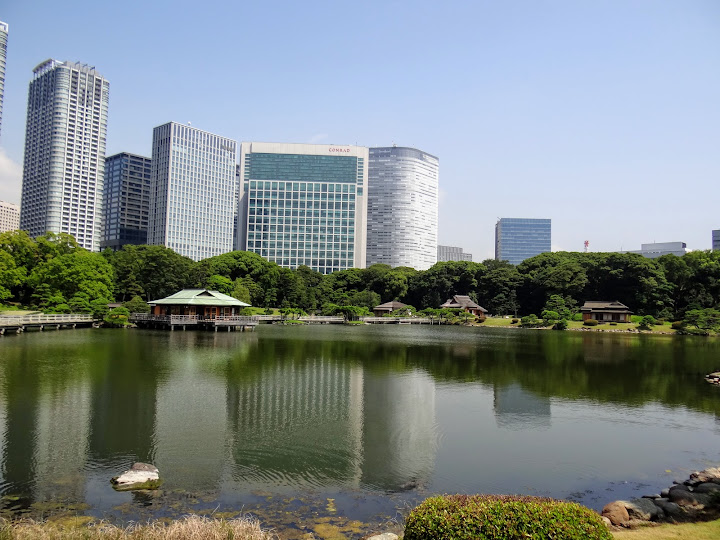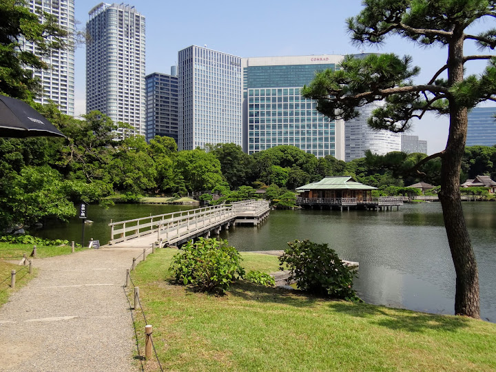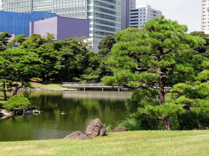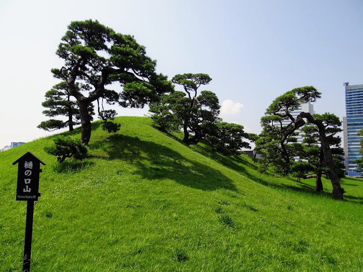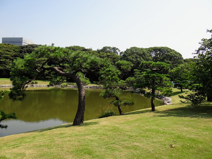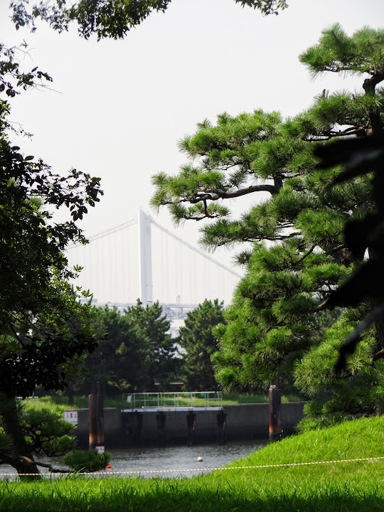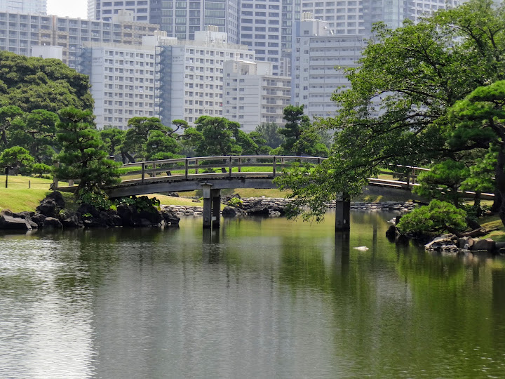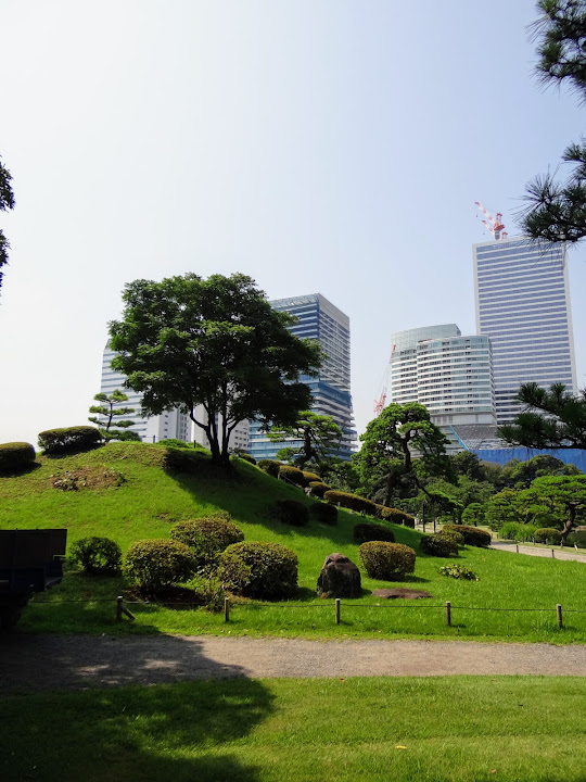 在築地場外市場用過早餐,步行約十分鐘便是此間。濱離宮所在地,原是江戶幕府德川家的獵鷹場,17世紀中葉,四代將軍家綱賞給弟弟、即後來的五代將軍綱重做為別莊,因綱重時任甲府宰相而稱為甲府濱屋敷。六代將軍家宣改名為濱御殿,十一代將軍家齊時達到今日規模;幕府末期成為海軍基地,稱為海軍所;明治維新後成為皇室離宮,再改名為「濱離宮」。戰後對外開放,並指定為國家特別名勝及特別史跡。抄書完畢。 純就觀光來說,此地是東京都心賞櫻兼紅葉名所,春季秋天俱有可觀。夏天嘛,一片綠意盎然,也不錯看。四週有護城河圍繞,上圖是通往入口「大手門」的同名橋樑,繞行一周之後,由較小的「中の御門橋」離開。另一個比較特別的出入口是水上巴士乘降站,可通往淺草、兩國、葛西等地。陸地一側有成排大樓,也是不錯的景觀。
