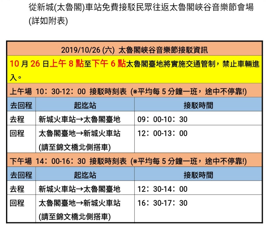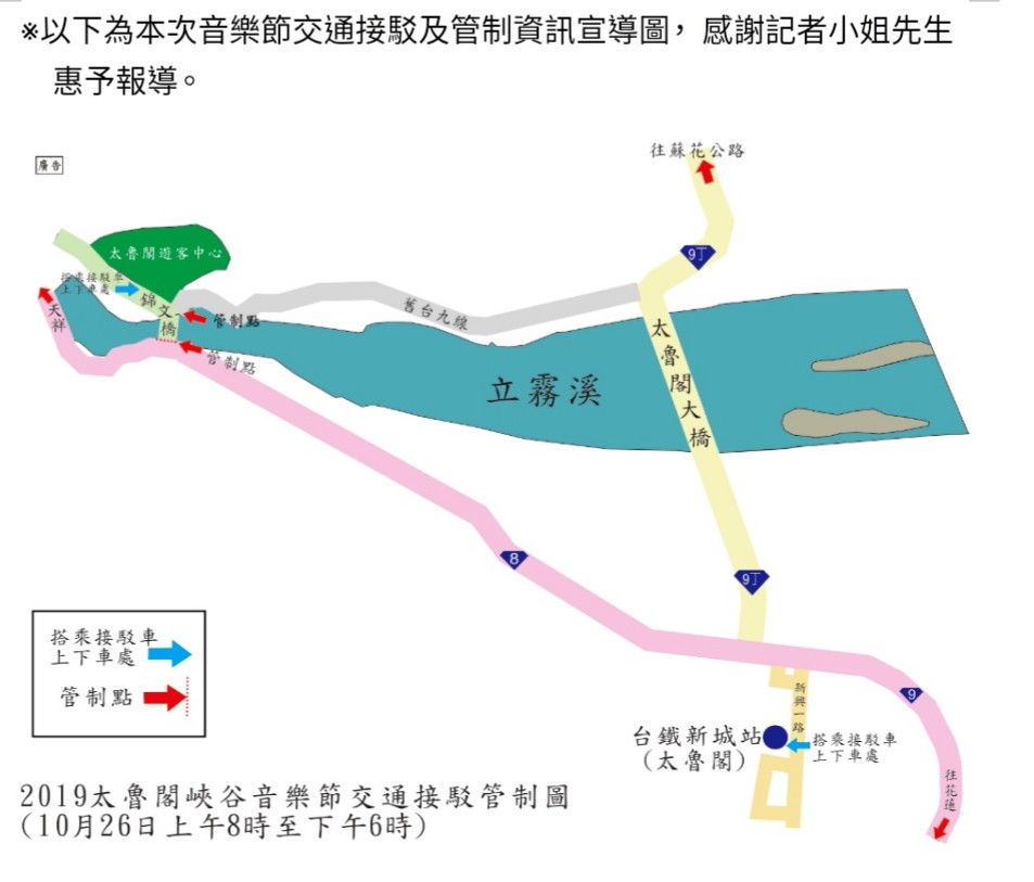 太魯閣國家公園管理處表示,為迎接眾多慕名而來的中外遊客人潮與車潮,特別用心規劃了相關交通接駁及道路管制等措施,並於活動前提供詳細資訊公告周知,使欲前來太魯閣參加峽谷音樂節的各界來賓,得以於事前妥為規劃運用相關交通工具,在兼顧舒適、便捷、體貼的目標下,順利地迎接與歡送前來參加音樂會的遊客。 本次的交通接駁及管制計畫如下: 1、巴士接駁部分: 於10月26日活動當天,配合音樂節演出時間:上午場10:30至12:00,下午場14:00至16:30;自早上09:00到下午17:30分止(平均5分鐘一班,中途不停靠),從新城(太魯閣)車站免費接駁民眾往返太魯閣峽谷音樂節會場。 2、在火車運輸部分: 太管處也已協調台鐵局加開x班次及加停新城站(太魯閣),遊客只要搭乘火車或開車至新城車站,就可轉搭免費接駁專車到太魯閣臺地參加峽谷音樂節。 3、在交通管制部分: (1)管制時間:10月26日上午8點至下午6點太魯閣臺地將實施交通管制,禁止車輛進入。 (2)舊台九線(台九丁線)至太魯閣大橋進入太魯閣臺地路段前,實施交通管制,禁止車輛進入。 (3)台九線進入太魯閣臺地前於錦文橋入口實施交通管制,禁止車輛進入。 4、車輛疏散改道: (1)由新城欲開車至蘇花公路遊客,請於台九線銜接台八線處右轉太魯閣大橋銜接台九丁線至蘇花公路 (2)由花蓮方向前來,開車欲轉搭接駁車遊客,請於台九線左轉新興一路至新城車站附近停車場停妥車輛後,轉乘接駁巴士至峽谷音樂節會場。 (3)由蘇花公路前來,開車欲轉搭接駁車遊客,請於行經太魯閣大橋後左轉台九線,約200公尺處再右轉新興一路至新城車站附近停車場停妥車輛後,轉乘接駁巴士至峽谷音樂節會場。