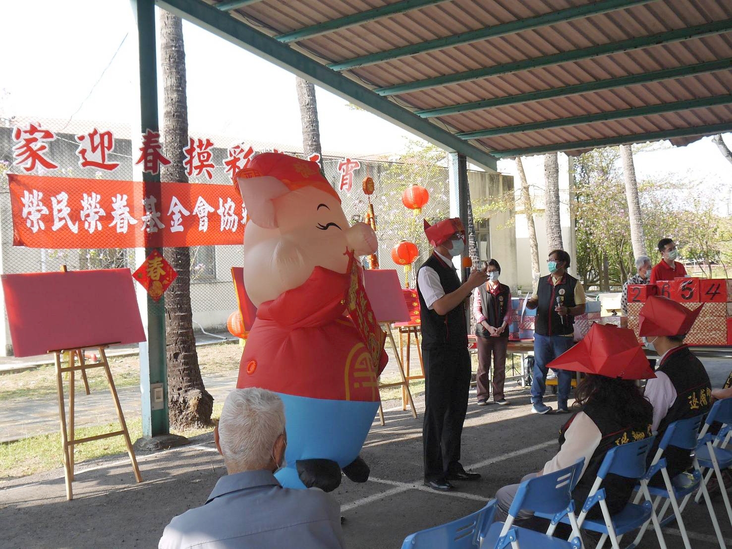 詹主任表示:今日舉辦迎春慶元宵活動,由契約廠商贊助摸彩品、榮民榮眷基金會協辦與提供猜謎獎品,讓這次活動更加生動與充滿喜氣,也讓住民感受到濃濃的過年氣氛;去(109)年因疫情關係很多活動都受到管制,榮家在遵守防疫規定下,想方設法辦理「臺東部落知性2日遊」、「嘉義1日遊自強活動」、「空軍官校微旅行」、「義大世界遊樂趣」等活動,紓解住民生活與精神壓力;今日規劃迎春摸彩慶元宵活動,以扮演財神爺角色,揪眾向住民拜春年,將福氣送給所有住民。