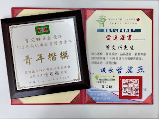 曾文昕中尉在擔任高雄市後備指揮部後服科連絡官期間,曾多次參與社會公益活動及主動投入口罩生產任務,更在108年獲得高雄市政府毒品防制局特殊貢獻獎表彰。