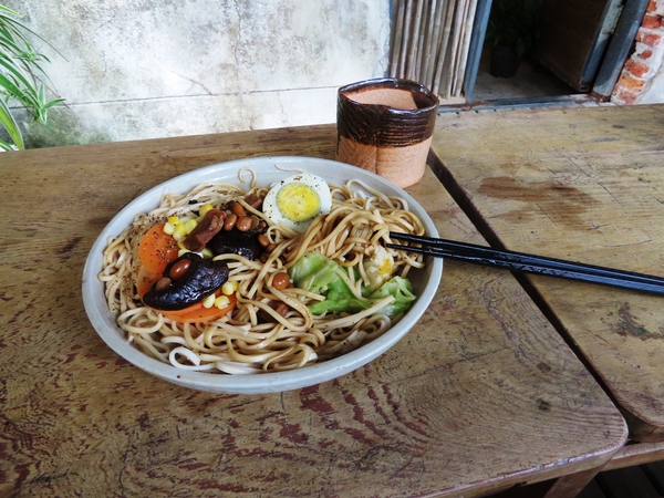 雲森箋上老孟味,蔬食半碗淡生涯 老孟蔬食麵150元 《那花兀自開著:宇宙戀人孟祥森》∣磚屋牆上掛著父親手書『那花,就那樣兀自開著』。被充滿母愛的女人呵護寵愛一生的永遠宇宙小子,如同被甘霖澆灌的花朵盡情開著。