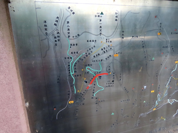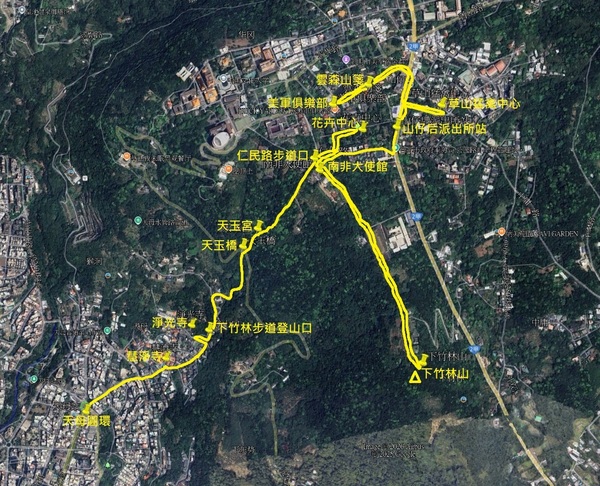 天母圓環→慧濟寺→淨光寺→下竹林步道中山北路七段190巷登山口→天玉橋→天玉宮→下竹林步道仁民路步道口(南非大使館旁)→花卉試驗中心→南非大使館→下竹林山▲三角點→回「花卉試驗中心」→草山猛禽中心→雲森山箋→美軍俱樂部→回「雲森山箋」午餐→山仔后派出所站