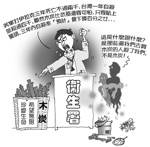 我們除了把香菸,酒類貼上警語警告會致癌之外,現在又多了一項木炭. 木炭其實是比菸酒要可怕,菸酒的危害是個人的(當然二手煙不好但是相較之下是輕多了),燒炭自殺的則會殺全家,這可是很嚴重的問題. 所以不才建議,不但衛生署藥貼警語,並且應該請警政署侯署長考慮將木炭與槍枝一樣,列入管制.凡是買木炭的都要登記考核,看看有沒有前科(至少是自殺前科),並且繳交燒炭保證金,萬一真的發生了,就可以繳交國庫作為日後掏空的本錢. |