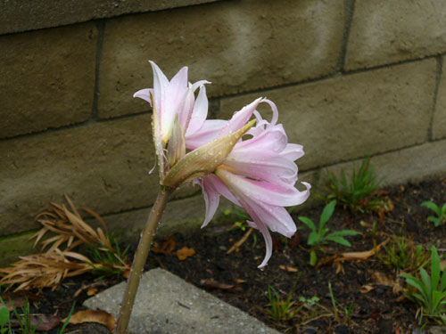 前院不知什麼時候冒出來一支粉紅色的百合花.前幾天從外面回來,老婆一下車就唉喲了一聲,嚇我一跳,還以為出了什麼事.原來是她一轉身剛好看到藏在松樹後面的這株百合. 可能不知是何處來的種子,老婆說百合是球根,一定是以前的房主種過,最近有水澆到就發芽了.不論如何,我們都很高興,真的是很美,晚飯後我們常走到前院去欣賞. 百合花期不長,趕忙找了個早晨拍了幾張,貼上來給好友分享. --------------------------------------------------------------- 謝謝"右眼是實心的藍"的指點迷津,網上有朋友幫忙真好. 我給另外一位朋友看了,他說可能不是,因為白肋華冑蘭得名來由是花瓣中間有一條白肋,還有就是白肋華冑蘭的花朵是向東南西北四方對稱開放的,我家的花不是.目前他也說不出來這種花的名字,可能還得再查查看. 謝謝幫忙.