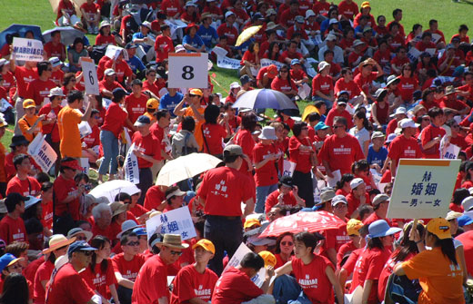 為了表達對於婚姻是一男一女組成的,洛杉磯的華人特別由角聲月報舉辦了一次"紅杉軍"的嗆聲活動.是在2004年夏天,大約有接近四千人參加這個一下午的活動.有的全家出動,小朋友的紅衫背上寫的是"我要爸爸和媽媽",可愛不?