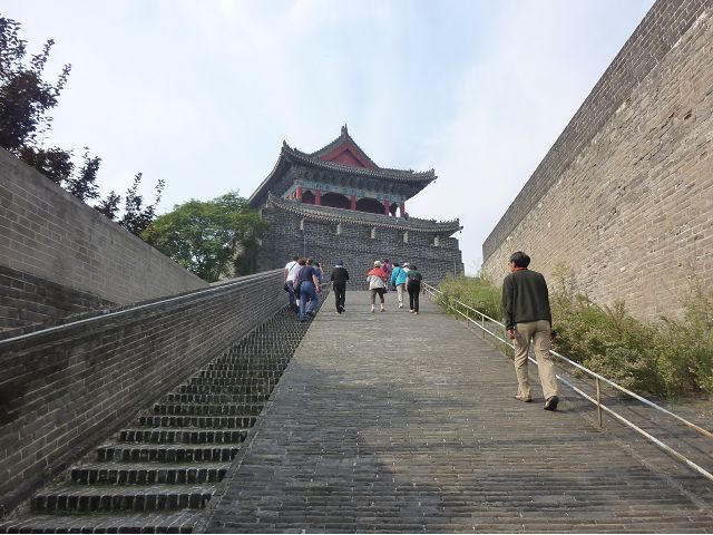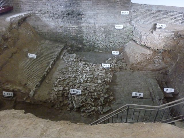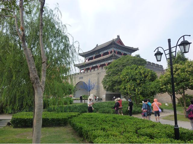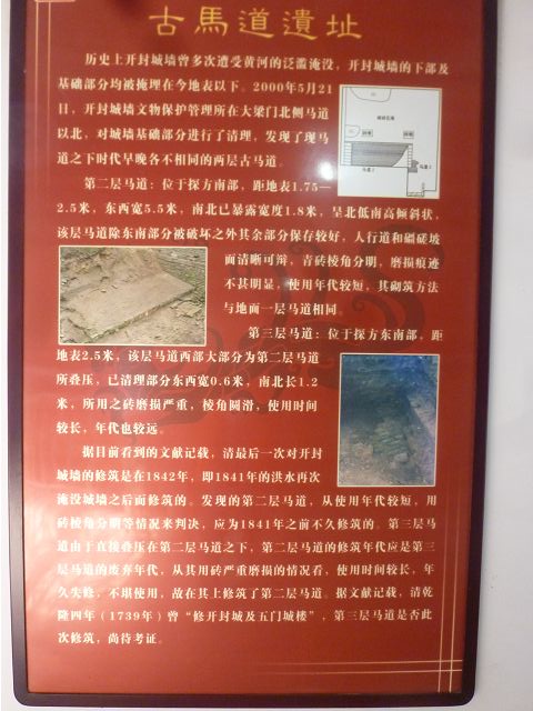 我們的開封古城行,先到大樑門,看城樓下的古馬道遺址、以及展示的多層疊壓古馬道,為開封獨特的城摞城歷史佐證,因其獨特的歷史意義和考古價值,現已被闢為古城牆博物館。開封古城牆歷經水患與兵燹,原有城門樓均已不存,目前所見的城牆建築為90年代以後所復建,全長14.4公里,是大陸現存的、僅次於南京城牆的第二大古城垣建築;大樑門於1998年重建,成為古都的重要象徵,採用青磚結構城門基底,設三個拱形門洞,城樓採用重檐歇山式建築風格,雕梁彩繪,古樸典雅,雄偉壯觀。古馬道遺址位於大樑門北側,循馬道斜坡登上大樑門城樓可看到第一層馬道,也能看到如搓衣板形狀的第二層馬道垂直疊壓第三層馬道的狀況,是開封城牆文物保護所2000年5月發現的古馬道遺蹟,埋藏深度和建築時代早晚各不相同,三層馬道一層摞一層、垂直疊壓,保存尚稱完好,是開封目前唯一能夠直觀城摞城奇觀的展示窗口。因此,開封城牆被列為全國重點文物保護單位,屬4A級旅遊景區,城牆周邊全部規劃為環城綠地公園,已成為開封市熱門的旅遊景點。