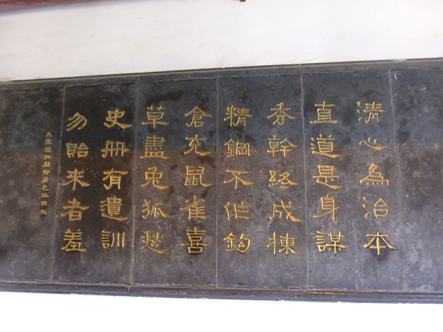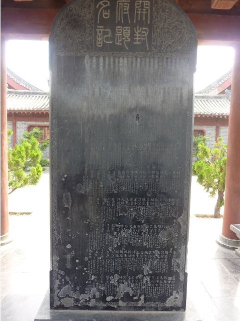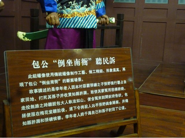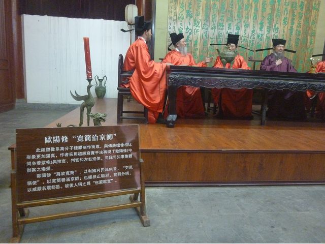 *府前照壁「開封府」三個大字,照壁背面巨大石刻浮雕「獬豸圖」,獬豸是古代傳說中能辨別是非曲直、善惡忠奸的神獸,是公正廉明的象徵。 *儀門兩旁各置一面鳴冤鼓和一面開道鑼,大殿正中置一方碩大的石刻開封府印,兩側碑亭,分別豎立「開封府題名記」(記錄曾任職的183位開封府尹)和「開封府尹題名記」石碑。 *穿過儀門進入庭院,當中豎立一塊石碑,鐫刻「公生明」三個大字,就是北宋官場戒石了,背面銘刻「爾奉爾祿 民脂民膏 下民易虐 上天難欺」,據說是宋太祖手跡,為北宋官場箴規。 *正廳是開封府的大堂,上方正中懸掛「正大光明」匾額,左右分懸「清正廉明」、「勤政為民」匾額,紅木公案上擺放著文房四寶、驚堂木、簽筒、令牌以及開封府的大印,後方鑲嵌一幅氣勢磅礴的海浪澎湃圖,案台兩側插列迴避、肅靜牌,最引人注目的是堂前龍頭鍘、虎頭鍘、狗頭鍘三口銅鍘,傳說是御賜包公執法時的特殊刑具,龍頭鍘用於懲處犯法的皇親國戚,虎頭鍘用於貪官污吏,狗頭鍘用於刁民惡棍,大堂莊嚴肅穆氣氛是為包公舖陳的開封府官衙。 *正廳後一座四合院,院內有齊民堂、梅華堂("呆呆"華堂)和東、西配殿。梅樹掩映下的梅華堂,大門面向開封府後門,方便老百姓從後門進來申訴打官司,世人稱「倒坐南衙」,傳說是包公倒坐南衙,便服問案的地方。 *歐陽修(紫衣者)與官員審理辦案場景,後人稱「包(包拯)嚴歐寬」,兩人風格不同,歐陽修為政寬簡,同樣以利國利民為宗旨。 *開封府東側的明禮院、六藝齋、演禮齋、拱奎樓等,是在開封府內建立的場所,以供舉子們科舉解試和臨時性講學、集會用。明禮院負責科舉、教育及慶典等事務,演禮齋用於禮儀訓練,六藝齋則與學術技藝(禮、樂、射、御、書、數)講習相關。拱奎樓為主要建築,供奉魁星,是北宋科舉時的考場。希望獨占鰲頭的考生會到這裡摸一摸鰲頭,增強心理建設。 *清心樓是開封府最高建築,樓名取自包拯一首五言詩:「清心為治本,直道是身謀。秀幹終成棟,精鋼不做鈎。倉充鼠雀喜,草盡兔狐愁。史冊有遺訓,無貽來者羞!」一樓大廳豎立一尊高大威嚴的包公立姿銅像,登樓俯瞰,園區仿古建築群氣勢恢弘,巍峨壯觀,似可為園區設計畫龍點睛。 參觀開封府,可謂再現了大宋官衙文化,而處處銘石、匾額、字幅、碑刻、楹聯、塑像等提示,則是體現北宋為官清、慎、勤的勤政清明風範,尤其為包公斷案如神下註腳,亦文史亦演義,並行不悖,很可觀且有趣。