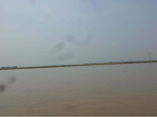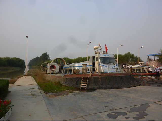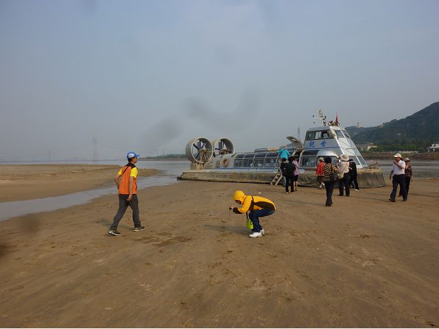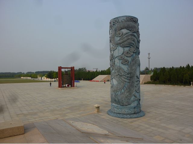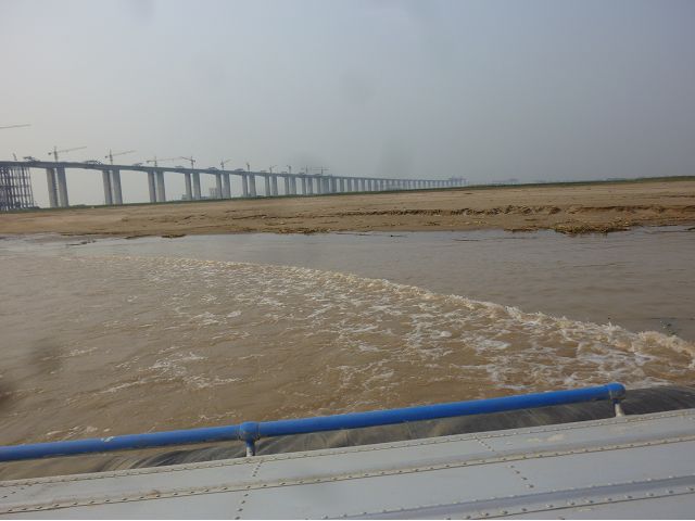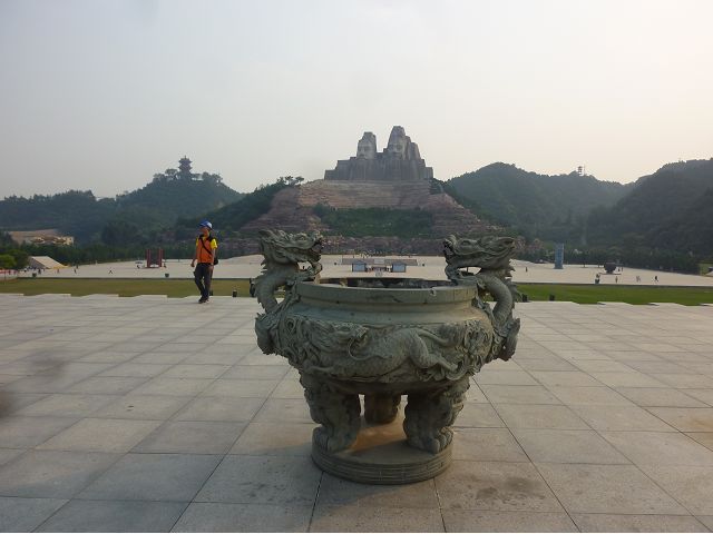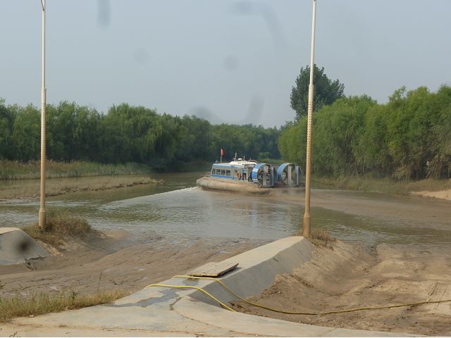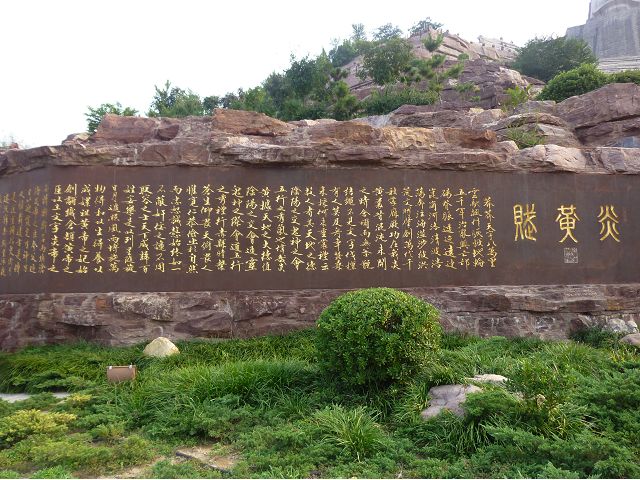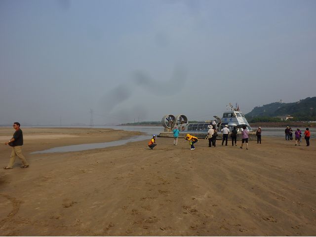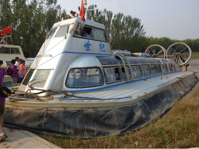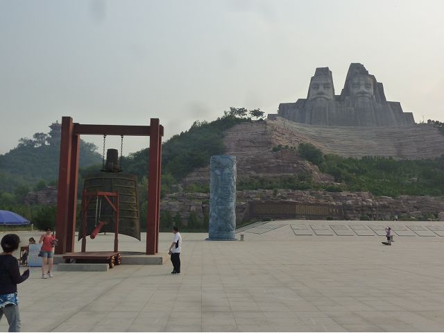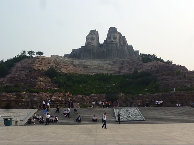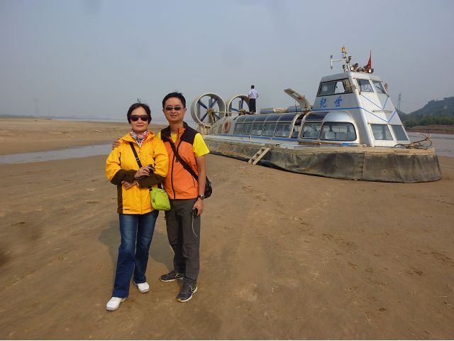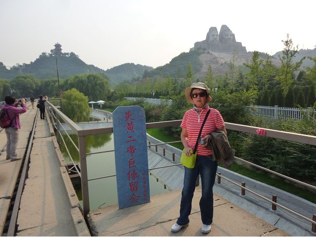 接著走訪黃河遊覽區,乘氣墊船遊黃河,參觀跨越黃河的第一座鐵路橋梁,參拜炎黃兩帝塑像。大陸稱黃河為母親河,黃河遊覽區屬4A級景區,打著"不登長城非好漢,不到黃河心不死"的觀光宣傳口號,古語云,"黃河百害,唯富一套",因泥沙淤積嚴重、多暗灘淺灘,不利航行,歷史上多次決口潰堤、氾濫成災,而搭乘世紀號氣墊船,卻能暢行無阻,不論沙洲陸地、淺水深潭,一律風馳電掣、如履平地,是一趟不同凡響又反差極大的黃河遊歷:碼頭在沙地,不在水岸邊,船底氣墊軟趴趴癱在沙地上,黑色塑膠布包覆著,待駕駛員(似坐在上方駕駛艙內)啟動鼓風機後,塑膠布整個鼓起來,托高氣墊船,然後緩緩離開碼頭、駛進沼澤地,再馳往滔滔黃河裡,我心也隨之雀躍;除駕駛員外,還有導覽員隨船解說,一趟航程約45分鐘,河面寬闊,濁流滾滾,卻是平穩舒適,如御風而行;遠望山陵上孤伶伶豎立一座尖塔,中有空隙,導覽員介紹說,那是楚漢相爭時的楚河漢界,當年劉邦、項羽之間的一道鴻溝,如今山河沖蝕堆積,風雲變換,僅剩一小溝,還爭什麼? 途中,氣墊船駛進一大片沙洲,停車,讓我們下船踩踩黃河沙土地、拍照留念,大家都興奮,玩沙、玩水,笑呵呵,老二還在沙地上寫下"黃河一遊",媽媽則拍照存證,只不知能留住幾多時?沙洲旁側一座大橋興建中,遠處一座使用中的紅色橋樑,據說,鐵道橋原有3座,因河床每年增高約60公分,一座已淹沒,一座雖未沒頂,但已無法使用云云,黃河淤沙之嚴重,聽起來就可怕。乘坐水陸兩棲氣墊船遊黃河的經歷,給人新奇的觀光體驗,氣墊船想去那裡就去那裡,如履平地,暢快淋漓,還可隨意登陸河中濕地,供乘客下船踩泥玩沙,與母親河親密接觸,回味童年嬉戲樂趣,確實令人難忘。