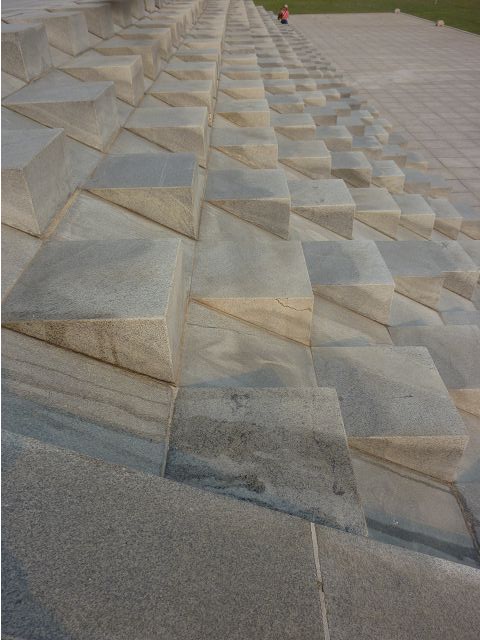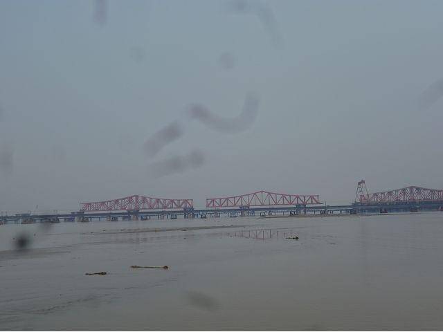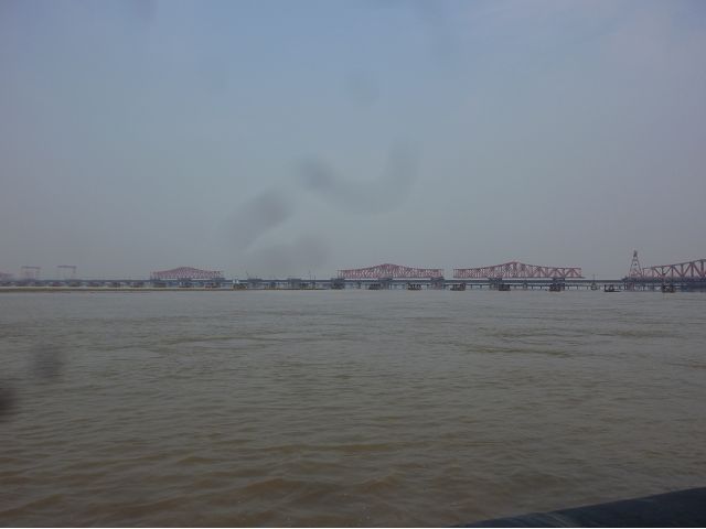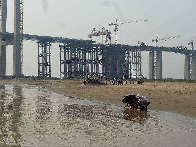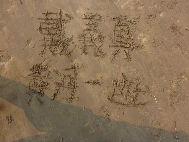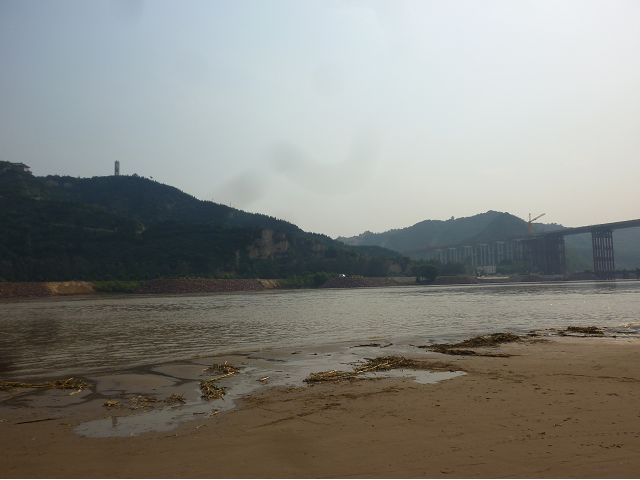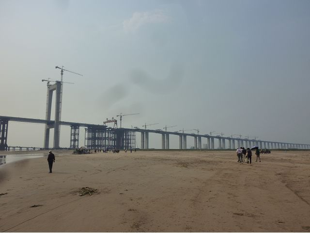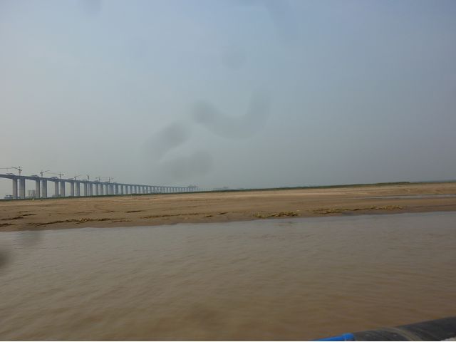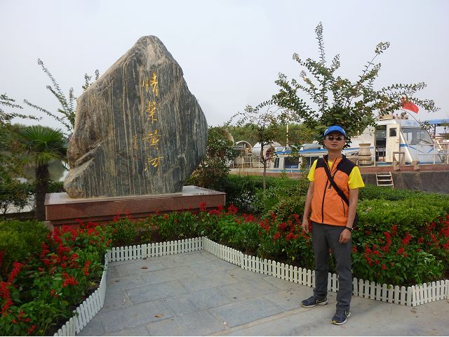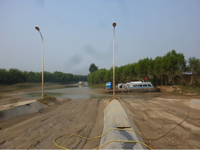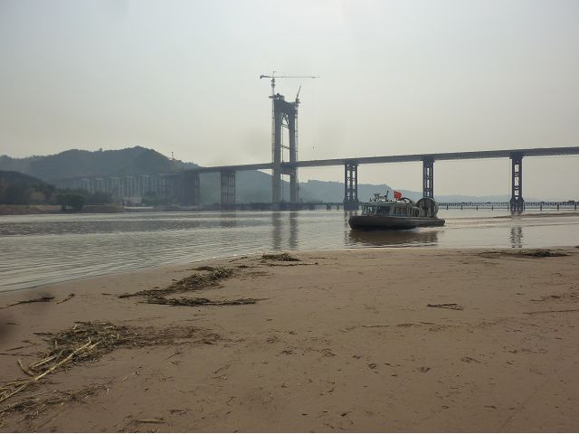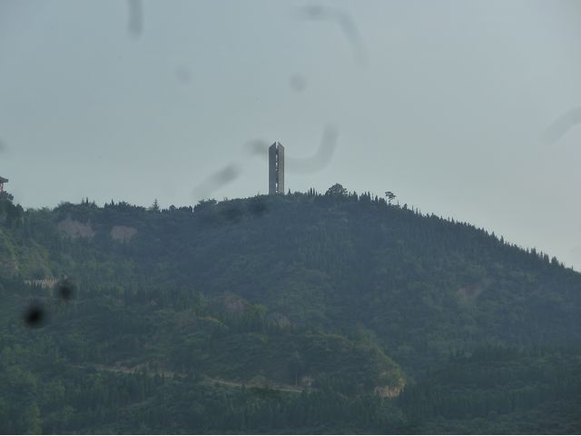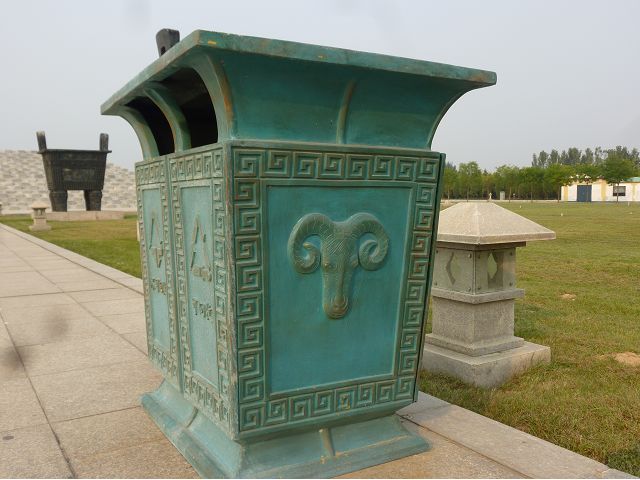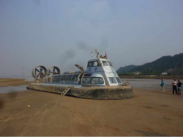 接著走訪黃河遊覽區,乘氣墊船遊黃河,參觀跨越黃河的第一座鐵路橋梁,參拜炎黃兩帝塑像。大陸稱黃河為母親河,黃河遊覽區屬4A級景區,打著"不登長城非好漢,不到黃河心不死"的觀光宣傳口號,古語云,"黃河百害,唯富一套",因泥沙淤積嚴重、多暗灘淺灘,不利航行,歷史上多次決口潰堤、氾濫成災,而搭乘世紀號氣墊船,卻能暢行無阻,不論沙洲陸地、淺水深潭,一律風馳電掣、如履平地,是一趟不同凡響又反差極大的黃河遊歷:碼頭在沙地,不在水岸邊,船底氣墊軟趴趴癱在沙地上,黑色塑膠布包覆著,待駕駛員(似坐在上方駕駛艙內)啟動鼓風機後,塑膠布整個鼓起來,托高氣墊船,然後緩緩離開碼頭、駛進沼澤地,再馳往滔滔黃河裡,我心也隨之雀躍;除駕駛員外,還有導覽員隨船解說,一趟航程約45分鐘,河面寬闊,濁流滾滾,卻是平穩舒適,如御風而行;遠望山陵上孤伶伶豎立一座尖塔,中有空隙,導覽員介紹說,那是楚漢相爭時的楚河漢界,當年劉邦、項羽之間的一道鴻溝,如今山河沖蝕堆積,風雲變換,僅剩一小溝,還爭什麼? 途中,氣墊船駛進一大片沙洲,停車,讓我們下船踩踩黃河沙土地、拍照留念,大家都興奮,玩沙、玩水,笑呵呵,老二還在沙地上寫下"黃河一遊",媽媽則拍照存證,只不知能留住幾多時?沙洲旁側一座大橋興建中,遠處一座使用中的紅色橋樑,據說,鐵道橋原有3座,因河床每年增高約60公分,一座已淹沒,一座雖未沒頂,但已無法使用云云,黃河淤沙之嚴重,聽起來就可怕。乘坐水陸兩棲氣墊船遊黃河的經歷,給人新奇的觀光體驗,氣墊船想去那裡就去那裡,如履平地,暢快淋漓,還可隨意登陸河中濕地,供乘客下船踩泥玩沙,與母親河親密接觸,回味童年嬉戲樂趣,確實令人難忘。