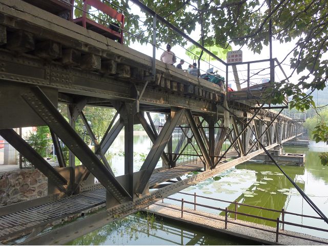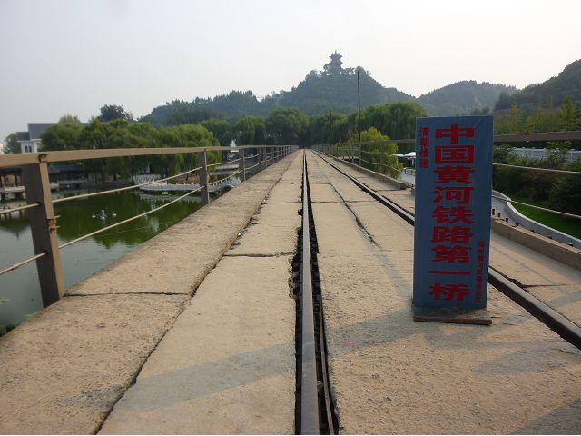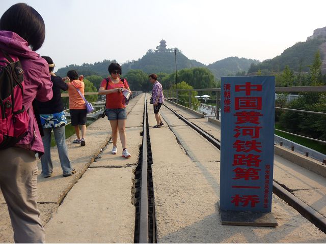 上岸後,到訪遊覽區裡的"黃河第一鐵路橋遺址",這是清末修建的平漢鐵路鄭州黃河橋,路旁樹立著石碑標識,橋下鋼樑結構橫跨河面,依然堅固,橋上鐵軌旁的水泥路面斑駁,也樹立兩塊藍灰底紅字標識,一為"中國黃河第一鐵路橋",另一為"炎黃二帝巨像留念",背景正是遠方山頭上的炎黃二帝大型塑像,理所當然成為遊客紛紛取景拍照的打卡熱點。 〈按:鄭州黃河鐵路橋於1903年8月開工建造,為單線鐵路橋,1905年11月竣工,次年4月通車。迨嘉應觀黃河鐵路大橋1960年落成,成為京廣鐵路跨越黃河的橋梁後,這座鐵路橋被取代了,遂轉為備用橋;至1969年10月,又改造為單行道公路橋梁,至1988年6月被拆除,留下黃河南岸5孔、160公尺橋梁建築,作為工業文物遺址保存,並作為遊覽區一部分開放遊覽迄今,但仍由鐵路橋工部門負責維護。〉