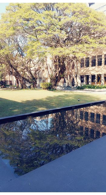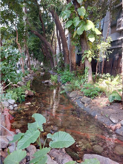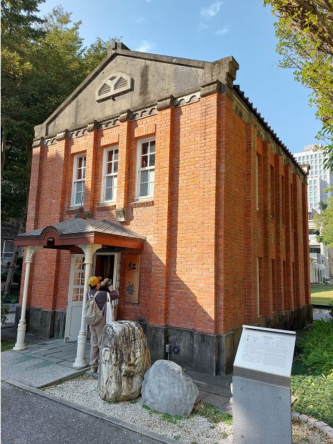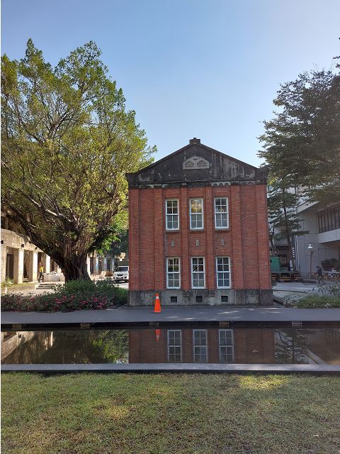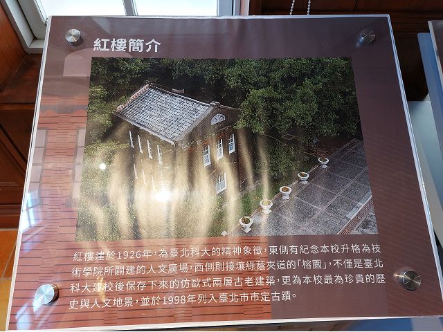 北科大(前身台北工專)是歷史悠久、科技見長的學校,介於忠孝東路、新生南路、八德路間,校園綠化頗佳,綠樹林立,尤其鄰近忠孝新生站4號出口的建築物外牆、牆面裝飾金屬結構、爬滿植被,特別引人矚目。這回召集人帶領我們去北科大,是為參觀位於校園中央、建於1926年的紅樓,小小一間兩層樓的紅磚建築,是該校百年校園的歷史象徵,並於1998年以「臺北工業學校紅樓」名義,列為台北市定古蹟。路經北科大校園外、新生南路人行道旁,見樹蔭之間流水潺潺,自成天地,進而發現是台北科技大學校區污水接管工程(含景觀復舊改善)施作的結果,不禁為之按讚。隨後進入校園,直趨紅樓,據介紹說明,紅樓係由日據時期「臺北工業學校」建築科、土木科、機械科、電氣科師生體現實作精神,共同完成的建築,其用途與管理單位曾隨著使用需要而不斷更迭,至1997年改作校史館,2016年12月啟動古蹟修復工程,於2017年5月23日完成修復後開放,一樓為常設展區,展示建築歷史及沿革,二樓陳列建築修復過程和留存的建築構件等;古蹟小而美,保存可謂完好。北科大校園開放,即使寒假期間,參觀時亦見有遊客三三兩兩前來觀賞。