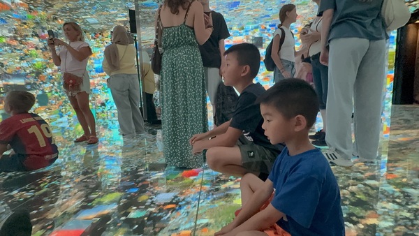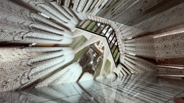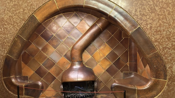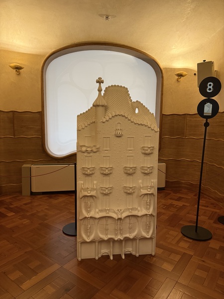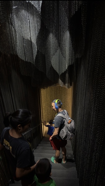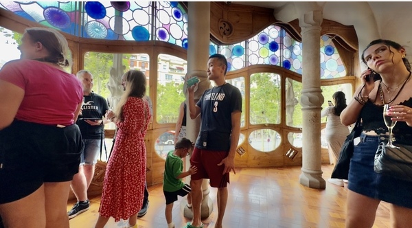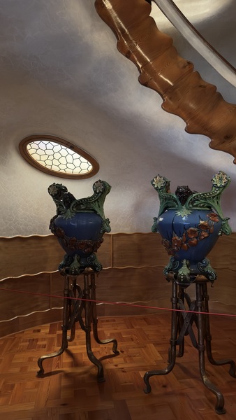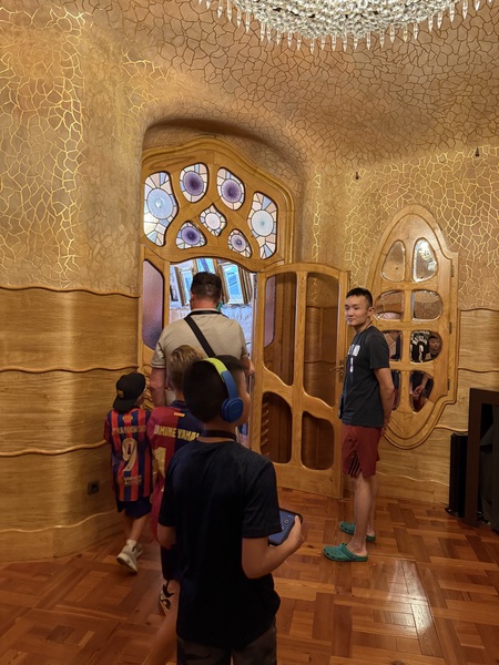 巴特略之家的外牆藍綠色馬賽克宛如魚鱗,陽台像一個個微笑的貝殼。室內的大廳天花板如同漩渦海流,樓梯扶手宛如鯨魚的脊骨,光線透過彩色玻璃傾灑,變成不斷流動的色彩。我們穿梭在樓梯間與各個房間,屋頂的龍背令人驚艷。 走到樓下,有一個沉浸式影像展的魔幻體驗。這次的參觀,不只能靜靜欣賞建築之美。館內還特別設置了沉浸式影像展,透過投影與音效,我們彷彿走進高第的腦海。天花板、牆面與地板同時流動著色彩與光影——海浪翻湧、森林生長、彩色玻璃破碎再重組。我們伸手去追那些投影的魚群,驚呼聲此起彼落。孩子們仿佛沉浸其中,我也感覺自己進入了一場超現實的夢境。