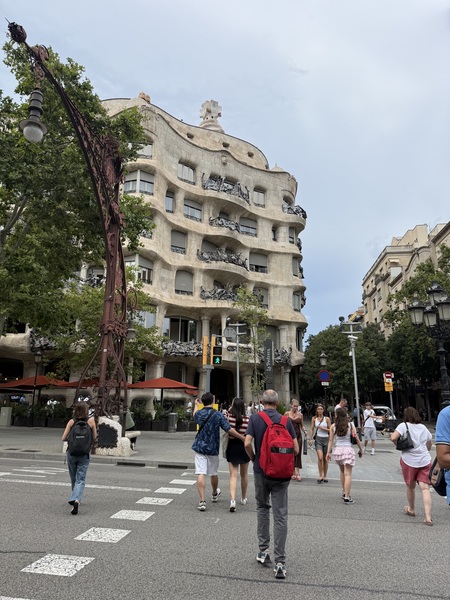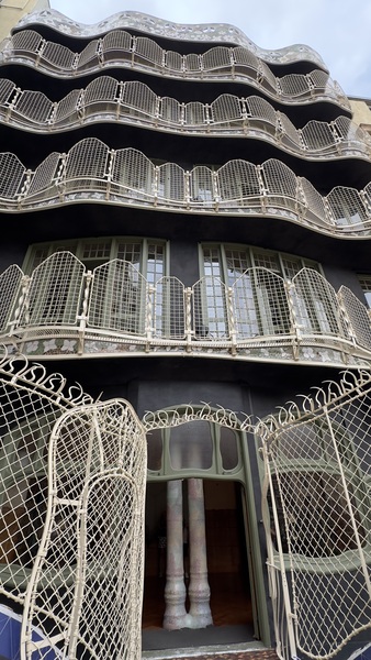 初見米拉之家 放下行李後,我們直奔高第的代表作之一-米拉之家(Casa Milà)。 米拉之家是加泰隆尼亞現代主義建築師安東尼·高第的代表作之一,坐落在巴塞隆納市區裡的Eixample擴建區、格拉西亞街(Passeig de Gràcia)上。建於1906年至1912年間,當時是富豪佩雷·米拉先生(Pere Milà)因非常欣賞高第為巴特略先生設計的巴特略公寓(CASA BATLLÓ),為了和富遺孀 Roser Segimon 結婚,而請高第為設計的。聯合國教科文組織在1984 年將包括米拉之家在內的幾個高第設計的建築列入世界遺產。 米拉之家有33個陽台,150扇窗戶,3個採光中庭,6層住宅,1層頂樓,1個地下停車場.其波浪形的外觀,是由白色的石材砌出的外牆,扭曲迴繞的鐵條和鐵板構成的陽台欄桿,有人覺得像非洲原住民在陡峭的懸崖所建造類似洞穴的住所,有人覺得像海浪,有人覺得像動物退潮後的沙灘,有人覺得像蜂窩的組織。 我覺得這整棟建築像一整塊被海浪雕琢過的岩石,外牆曲線柔和,陽台鐵雕如同海草般蜿蜒,很像一塊特大號的淺棕色海綿。