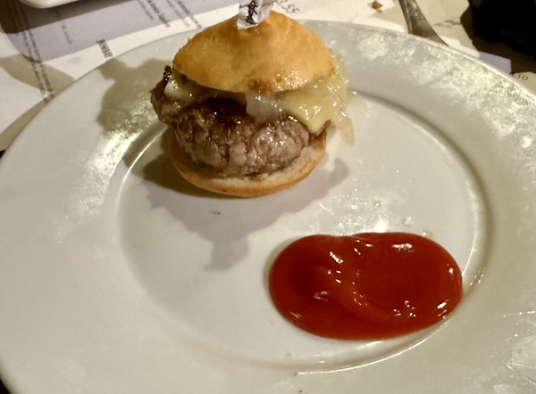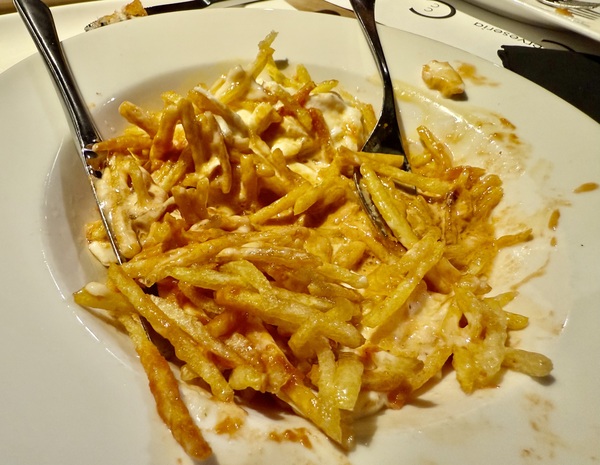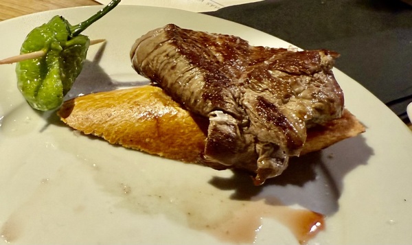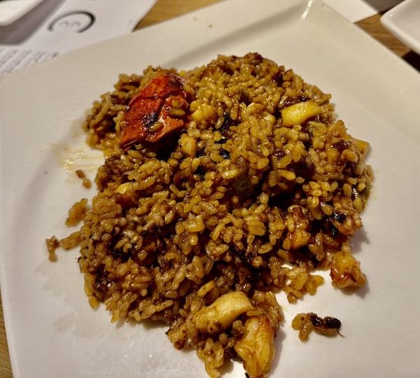 木質吧檯後的師傅忙著擺盤各式 Tapas。桌上很快擺滿了可樂餅(Croquetas)、蒜香蝦(Gambas al Ajillo)、番茄羅勒 Bruschetta,以及酥香帶辣的馬鈴薯(Patatas Bravas)。我一向很喜歡吃西班牙的Tapas,很像中國人的飲茶,分量不多但很精緻,且可以品嘗許多不同的食物。