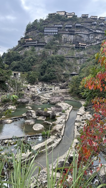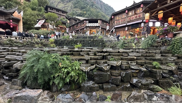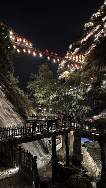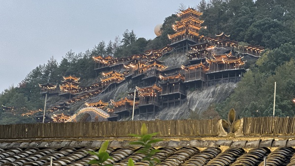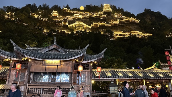 尤其當夜幕降臨,燈火亮起,這片山谷看起來像是被重新召回的人間。 吊腳樓沿著峭壁鋪展,像是被山體托住的時間。木窗透出暖黃的光,仿佛有人在裡面生活。我雖明知這些多半是為觀光客設計的場景,卻還是不由自主地錯覺,彷如置身仙境。