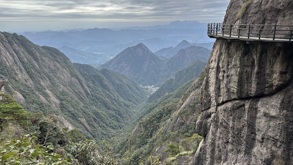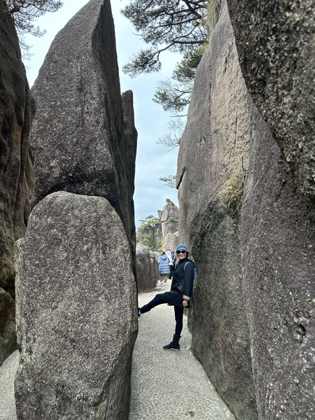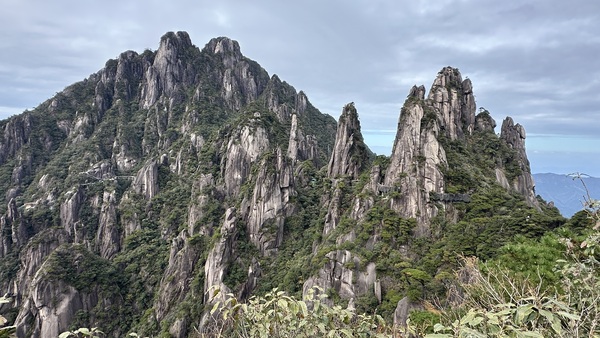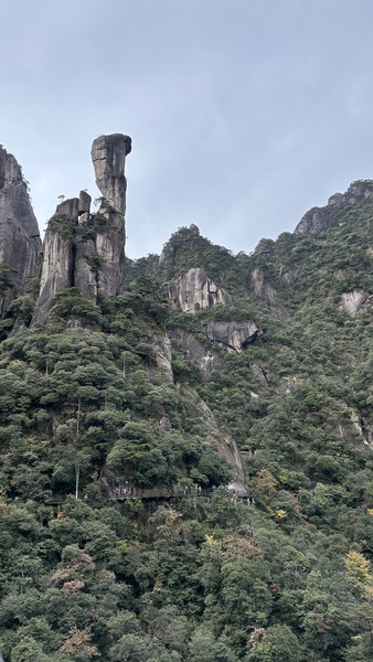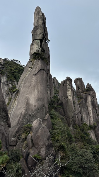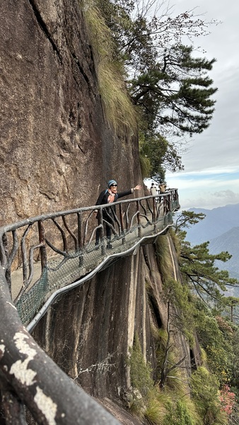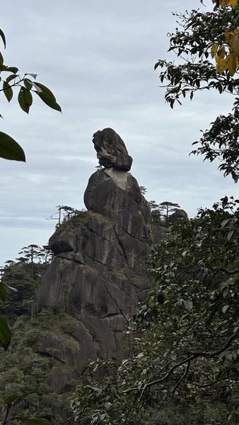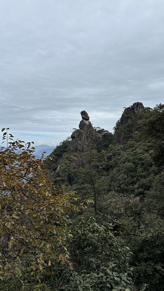 第二天前往三清山。 三清山也是位於上饒,是懷玉山脈的一部分,屬花崗岩峰林地貌。 「三清」之名,源自道教中的玉清、上清、太清三神。東晉以來,道教逐漸在江南山岳間扎根,而三清山因其峰形奇特、雲霧常年繚繞,被視為可通天界之地。宋、元之後,道觀陸續建於山中。 我們搭索道上升,下了纜車走到女神峰。女神峰因為長得像一位低頭沉思的女神而得名。從不同角度看去,有時像年輕的公主,有時像中年的女王。那塊岩石,靜靜站著。不需要解說,一眼就可以懂為什麼叫「女神峰」。它不像雕塑那樣刻意,倒像是時間自己站成了形狀,肩線、額角、低垂的目光都好逼真。讓人感受到女神那份被無數次風雨打磨過的堅定。