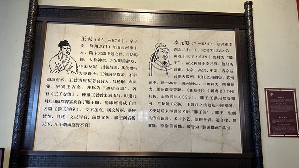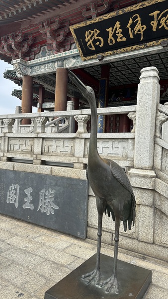 我們從中山北路打滴到景德鎮火車站,回到南昌已晚。第二天一早去南昌的滕王閣。 滕王閣之所以這麼有名是源於王勃寫的《滕王閣序》。《滕王閣序》之所以不朽,是因為它把「極致才華」和「人生失意」寫在同一個風景裡,而且是26 歲的王勃的隨興之作,被驚為天才。 公元 675 年,滕王閣宴會上,王勃只是被臨時點名「寫一篇」。結果他幾乎不打草稿,當場揮筆,寫出一篇結構完整,音律嚴整的駢文。在場的權貴、文人 全都服了。 最有名的「落霞與孤鶩齊飛,秋水共長天一色。」是千古絕唱。