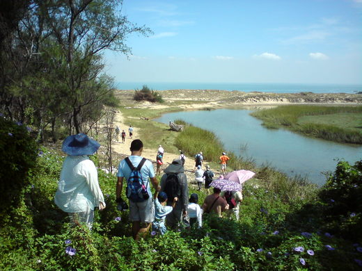 只聽過 「 花東海岸 」, 沒聽過 「 金東海岸 」 吧 ?! 本來我以 「 東海岸 」 稱之 , 但發現聽起來像是台灣 「 東海岸 」, 後來看了主辦單位的新聞稿 , 才發現是 「 金東海岸 」 健行 。 所謂的金東海岸就是 「 金門東邊的海岸 」,這 是金門登山健行協會 9 月 5 日的活動 。 我猜想這活動 「 前無古人 」, 以前沒人辦過 ――因為兩岸對峙時期的 金門 , 軍事據點遍佈海岸線 ;甚至 到十年前 , 閒雜人等下海 , 馬上會有人前來 「 勸導 」 ( 下海必須要有蚵民證或漁民證 ) , 遑論沿著海岸線走 ! 此活動由金門登山健行協會主辦 ,該會 的發起人是 「 瓊林寄民宿 」 蔡爸 ,他是 台灣百岳的山友 , 二年多前落戶金門 。 蔡爸頗擔心這一天參與的人數 , 根據前幾次的經驗 , 可能因為宣傳不夠 、 日期正好跟金門的祭祀活動撞期 、 漏掉通知會員等原因 , 以致參加的人數不如預期 。 於是我大力號召朋友 , 再加上我們一家四口 , 基本班底 7 個跑不掉 。 活動前一天 , 金門日報將此活動以新聞稿形式刊出 , 蔡爸很高興來電詢問有意願者 4 人 ! 其實這次的集合地點以及回程的交通都較以往複雜 : 行程預定在 「 山外車站 」 集合 , 搭乘八點五十分公車前往 「 田浦 」, 下車後 , 從田浦沿著海岸線 , 經過田埔水庫出海口 、 碧山旁的許白灣 、 后扁 、 山后 的 東割灣 、 獅山海灘 , 一直到青嶼 。 整個行程原訂八公里 。 我之所以使用 「 原訂 」, 是因為山后寒舍花到東割灣這一段海岸線不好走 , 必須要先上岸走陸路 , 再從東割灣下海 , 之後還會有兩段岩岸 , 直到獅山海灘之後 , 就是一片平坦沙灘了 。 你問我 : 怎麼這麼清楚 ? 因為山后海邊是我 「 管區 」, 三面環海 , 所有可以去的海邊 , 我差不多都去過了 ; 也經常從山后海邊往南望向后扁 、 許白灣 , 只是從來沒把這些海岸聯成一線 。 我喜歡這次行程 , 但我打算走到山后 , 上岸走陸路時 , 就直接走回家 。 我欽佩大禹的精神 , 但無法學習他 「 三過家門而不入 」, 我還小人心態猜想他 「 家有悍妻 」 所致 。為何是「 原訂 」 ?且聽接下來的報導。 算一算時間 , 健行到山后的時間接近中午 。 於是我自告奮勇跟蔡爸說 :請 大夥到我家用餐 。 我們煮大鍋麵 , 這樣才有 「 登山的感覺 」。 先前提及 , 這次的集合地點以及回程交通都較以往複雜 , 許多住在金城 、 瓊林等地的朋友 , 必須先到島東的山外集合出發 , 回程預定從青嶼搭公車 , 許多人可能要轉二 、 三班公車才能回到家 ( 由於轉車,亦須早起出發 )。 平常大夥習慣開車想去哪就去哪 , 參加這次活動違反慣性 , 也考驗參加者的決心 。 「 拋開慣常的交通方式 」 其實也是旅行意義之一 , 這是一種暫時性角色轉換 。 我們搭上公車 , 好不興奮 ,好久 沒有這種 「 遠足 」 的感覺了 ! 更開心的是 , 參加的人數非常踴躍 , 是協會成立以來參與人數最多的一次 ! 真是出乎意料之外 ! 人來瘋的我 ,忍不住 就在車上幫大夥拍照留念 ! 到底有多少人參加 ? 我當時尚不清楚 , 只知道我的鏡頭裝不下所有的人 ! 公車繞進許多聚落 、 也經過許多我們沒走過的路 , 終於來到田埔 。 由於我們這些在地人都缺乏搭公車經驗 , 全部的人都以為司機知道我們將在田埔下車 、 也以為公車會開進田埔聚落裏 ,我們 全錯了 ! 將近一車的人 , 沒有任何人按 「 下車鈴 」, 眼睜睜看著車子停靠田埔外圍的公車站後 , 呼嘯前行 !大夥傻眼! 下一站是 「 大地 」, 我們一行人浩浩蕩蕩在此下車 。 雖然坐過站 , 大夥仍然心情超 High , 連 「 過站不停 」 都成了旅程的一部分 。 司機跟僅剩的幾名乘客 , 看著我們魚貫下車 , 眼睛都看直了 ―― 這輛車快變成我們的專車了 。 金門人搭公車不用錢 , 只有我這個忘記帶公車卡的在地人 ,要 花錢 12 元買票 。 下車後 , 大家排排站 , 來張大合照 ! 重點有二 , 一是 「 會旗 」, 趕快打開 ;二是「 參加的人好多 」!難怪 承辦人笑得合不攏嘴 , 三十幾個ㄟ !希 望這記錄很快會被打破 、 參加人數攀升 , 大家多多登山健行 、 健康一生 ! (這宣揚的語氣,蔡爸看了會很滿意) 頂著烈陽 , 我們出發了 ! 由大地沿著田埔水庫走 , 從水庫閘口旁小路下海 ,眼前 這片平緩美麗的海灘是許白灣 。 天氣真好 , 陽光普照 , 許多人乾脆脫了鞋子 、 踩著浪花走 ,我也是其中之一, 海水好清涼 、 細沙按摩腳ㄚ好舒服 ! 小朋友一邊踩水 、 一邊觀察海洋生物 , 包括幾隻圓圓 、 藍色的水母 ,其 底下是細細的觸角 , 近距離觀察 , 經驗難得 。 近年 , 后扁海邊豎立了二座白色風車 ( 金門唯一的風力發電 ) , 每次從山后望過來 , 角度的關係 , 風車下方受樹遮擋而顯得矮短 ; 今天從南側這角度看過去 , 風車顯得好看多了 。 說實話 , 我不喜歡風力發電 ,雖然它比起其他發電方式似乎環保許多。 我的故鄉澎湖中屯島海邊設立了一群風車 , 一來風力發電要 「 風力持續 」 以及 「 風車數量夠多 」 才具有發電效率 。 澎湖冬天風大 , 但風車轉速是保持 「 恆速 」, 風大不會讓它發電更多 ;而 夏天卻經常沒風 , 整排風車就晾在那裏 , 充其量成為旅客拍照的地景 。 金門的風力發電目前只架設兩座 , 應是試驗性質 ,此更無 發電效率 。 二來 , 風力發電的扇葉噪音很大 。 中屯有位在風車附近養羊的村民張靜山 , 懷疑風車造成他的羊 「 失眠 、 暴斃 」, 他告訴聯合報記