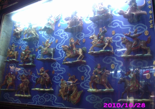 「三十六官將」,又稱「三十六關將」,源自中國古時候外五營三十六萬兵馬,以及領軍的三十六官將觀念。 其主要功能,和「五營兵將」一樣,都是主神的近衛軍,負責調兵遣將,護衛主神的安全。 他們一般並不立像,僅用木偶頭加以代表,有的廟宇會花大錢雕塑,甚至用交趾陶燒出塑像,並不多見。 事實上,絕大部分的廟宇,僅將他們的畫像畫在門板上,也有同樣的意思,他們的稱號如下…… 01紀仙姑(騎鶴)、02連聖者(騎豹)、03五龍官(騎馬)、04鎖大將(騎麒麟) 05金舍人(騎獅)、06倒海大將(騎虎)、07李仙姑(騎鶴)、08馬龍官(騎馬) 09劉聖者(騎獅)、10枷大將(騎馬)、11康舍人(騎馬)、12移山大將(騎馬) 13趙元帥(騎虎)、14殷元帥(騎馬)、15岳元帥(騎象)、16王孫元帥(騎鹿) 17辛元帥(騎獅)、18必大將(騎龍)、19康元帥(騎馬)、20溫元帥(騎獅) 21咒水真人(騎馬)、22鄧元帥(騎牛)、23李元帥(騎麒麟)、24高元帥(騎馬) 25勸仙姑(騎鶴)、26張聖者(騎麒麟)、27拿大將(騎牛)、28江仙官(騎馬) 29虎加羅(騎獅)、30食鬼大將(騎麒麟)、31何仙姑(騎鶴)、32蕭聖者(騎豹) 33捉大將(騎馬)、34紅化官(騎馬)、35馬加羅(騎麒麟)、36吞精大將(騎虎)。 |