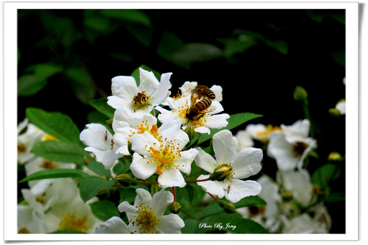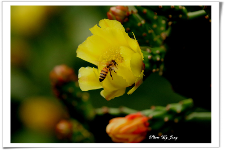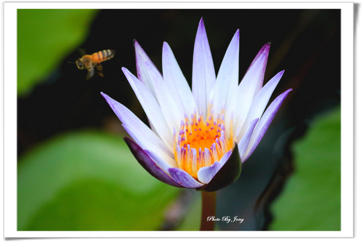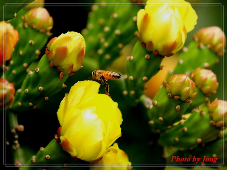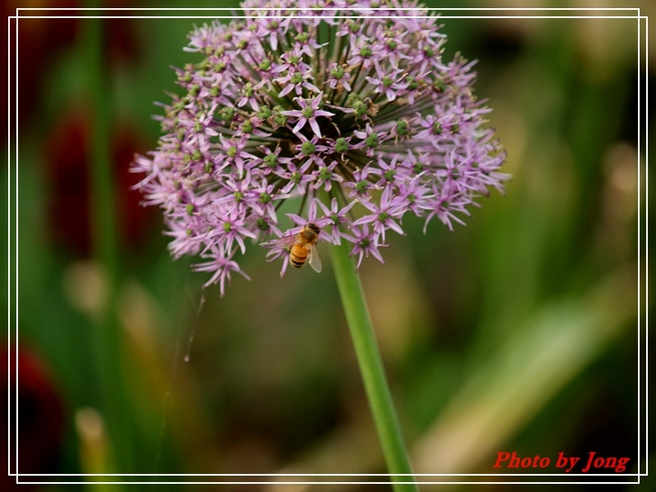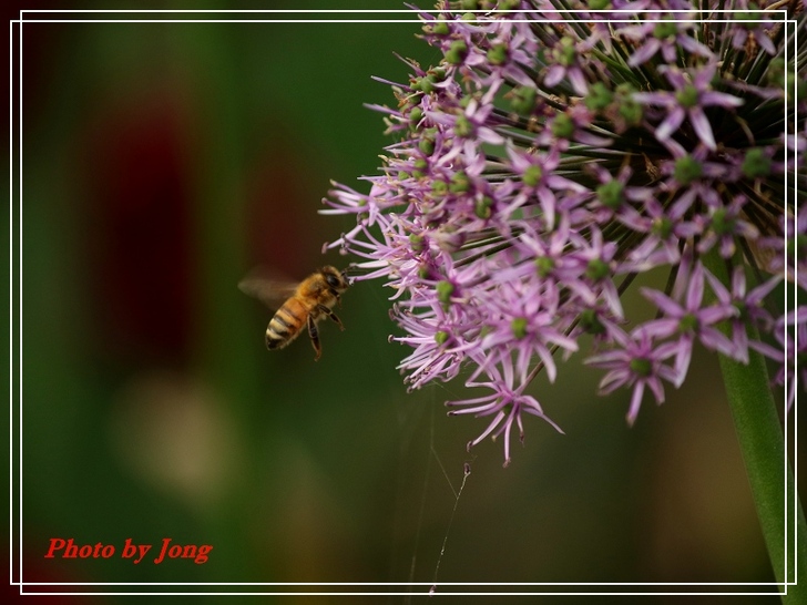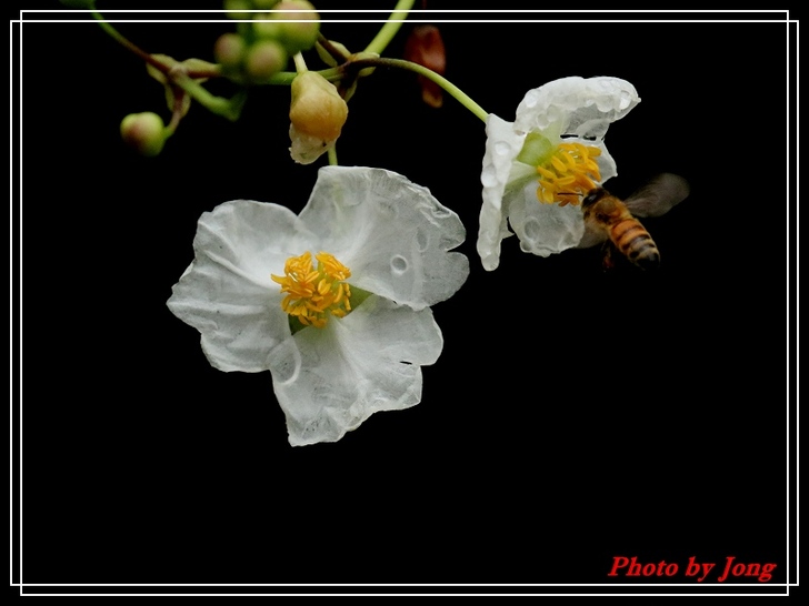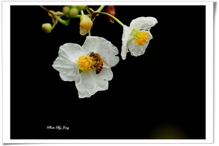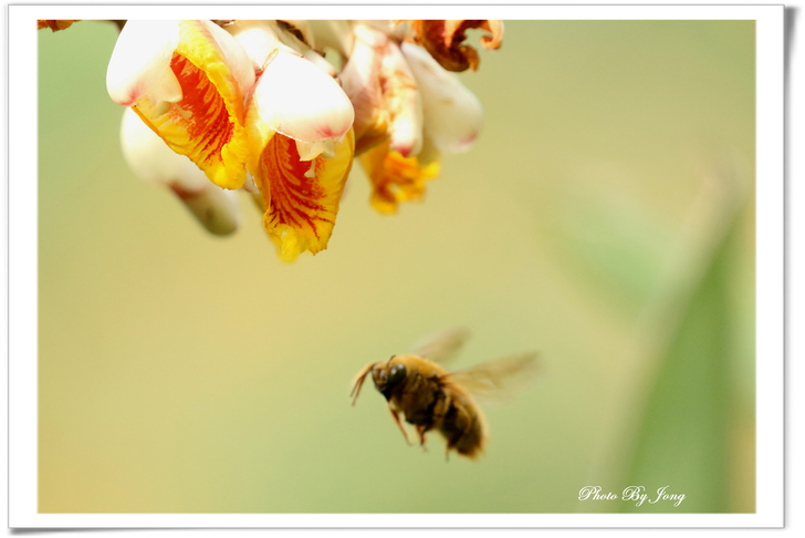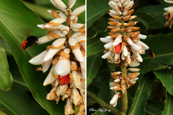 繡球葱、澤瀉、睡蓮+西洋蜂,月桃+熊蜂。 你遊園或郊野時,不妨可以留意,是否有蜜蜂正在花間穿梭忙碌呢?其實牠們正是幫助花樹授粉完成結果的小精靈啊!最近看到報導,即使是室內人工培育的蔬果,也不得不特意養蜂來幫忙完成花朵授粉的工作呢。 然而,今年不知是受天候的影響,亦或是現今台北都會園區植栽的草花數量大幅減少了,相對感受到的是,能見到的蜜蜂數量較往年真的減少了。就一個觀察者而言,但願,就像許多植物的花況一樣,往往並不是年年盛況,譬如今年台北都會的櫻花花況就大不如前,因為花況難免有周期性,是否蜜蜂相對減少也有周期性呢?只能期待,立夏(五月五日)之後能在花間看到更多嗡嗡勤作工的小精靈的活動吧。