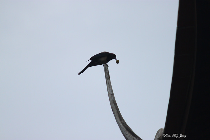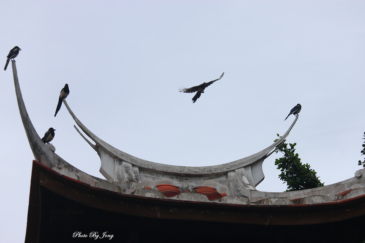 許多鳥鵲時常會選擇燕尾飛簷做為停歇的落腳點。白頭翁、家八哥、大卷尾、紅嘴黑鵯及喜鵲。 燕尾飛簷的翹尾,因為向上昂揚的造形,讓人聯想到振翅欲飛的一雙翅膀,因為凸出於屋脊之上,確實吸引了鳥雀的青睞,時常會選擇燕尾飛簷做為停歇的落腳點。欣賞燕尾飛簷時,不只是看到形式欲飛,也名副其實的可以捕捉到鳥雀飛翔相互搭配的實景啊! 燕尾飛簷的古厝,每當落日時分,或許因為,林安泰古厝的開放時間至下午五時截止,五時後則人去園空,許多鳥鵲,在沒人干擾下,會更樂意在古厝園區活動,因此,比較常見到飛鳥棲落屋簷紛飛的場景,也讓古厝更平添一份詩情畫意。