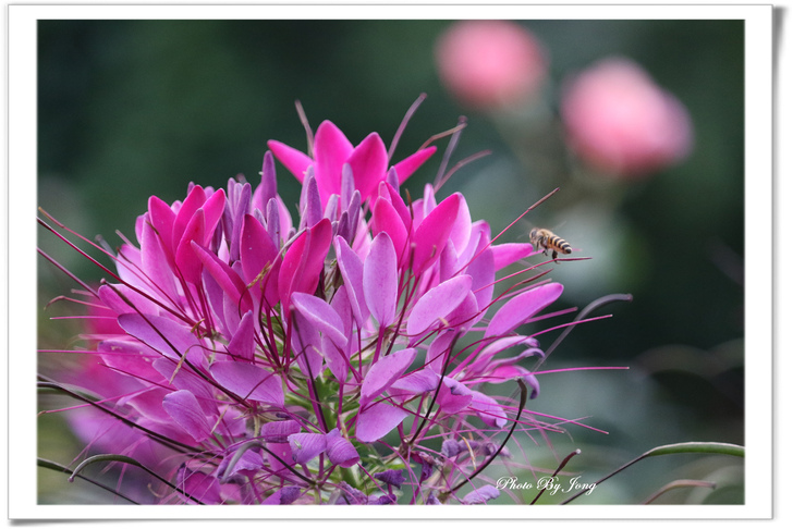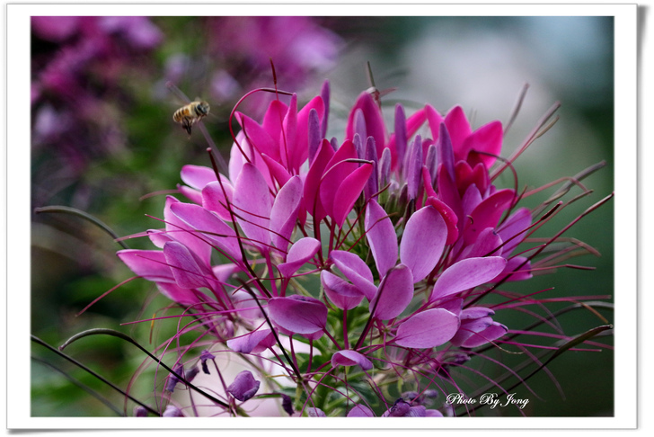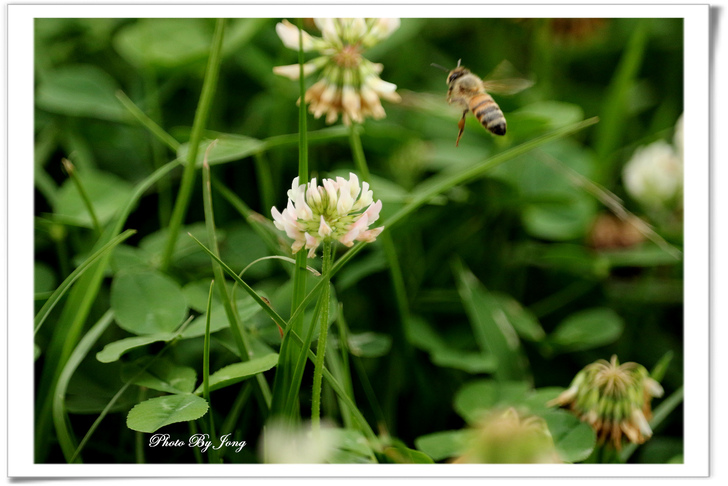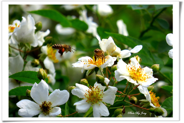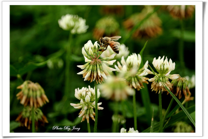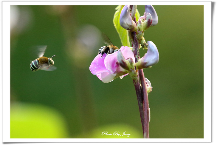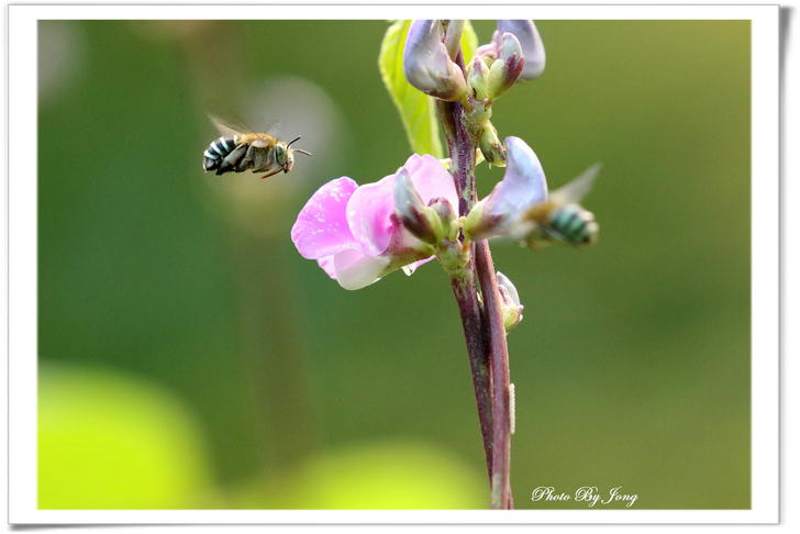 紫花鵲豆+青條花蜂、白花三葉草、醉蝶花+西洋蜂。 因為,沒有蜜蜂授粉,植物繁衍就會嚴重受限,依靠植物生存的牲畜也無法生存、而缺少糧食的人類,生存自然也就面臨困境了。 在文末即提出:「生態環保,切身利害,多觀察你生活周遭的蜜蜂是否還在飛舞吧!」 <遊園花開見蜂來> 春城無處不飛花,結伴遊園暖陽下。 微風輕拂傳芳香,蜜蜂花間採蜜忙。 沒錯,春來百花開的季節,正常來說,原本在都會的公園或郊野,應該正是蜂蝶踴躍出來活動的時間,也正是觀察蜜蜂忙碌採花授粉的好時節。所謂:「花若盛開,蝴蝶自來。」其實,花樣繁多,許多植物並不受蝴蝶的青睞,反而是蜜蜂的所愛。因此,若說「花若盛開,蜂蝶自來。」或許更接近事實吧。
