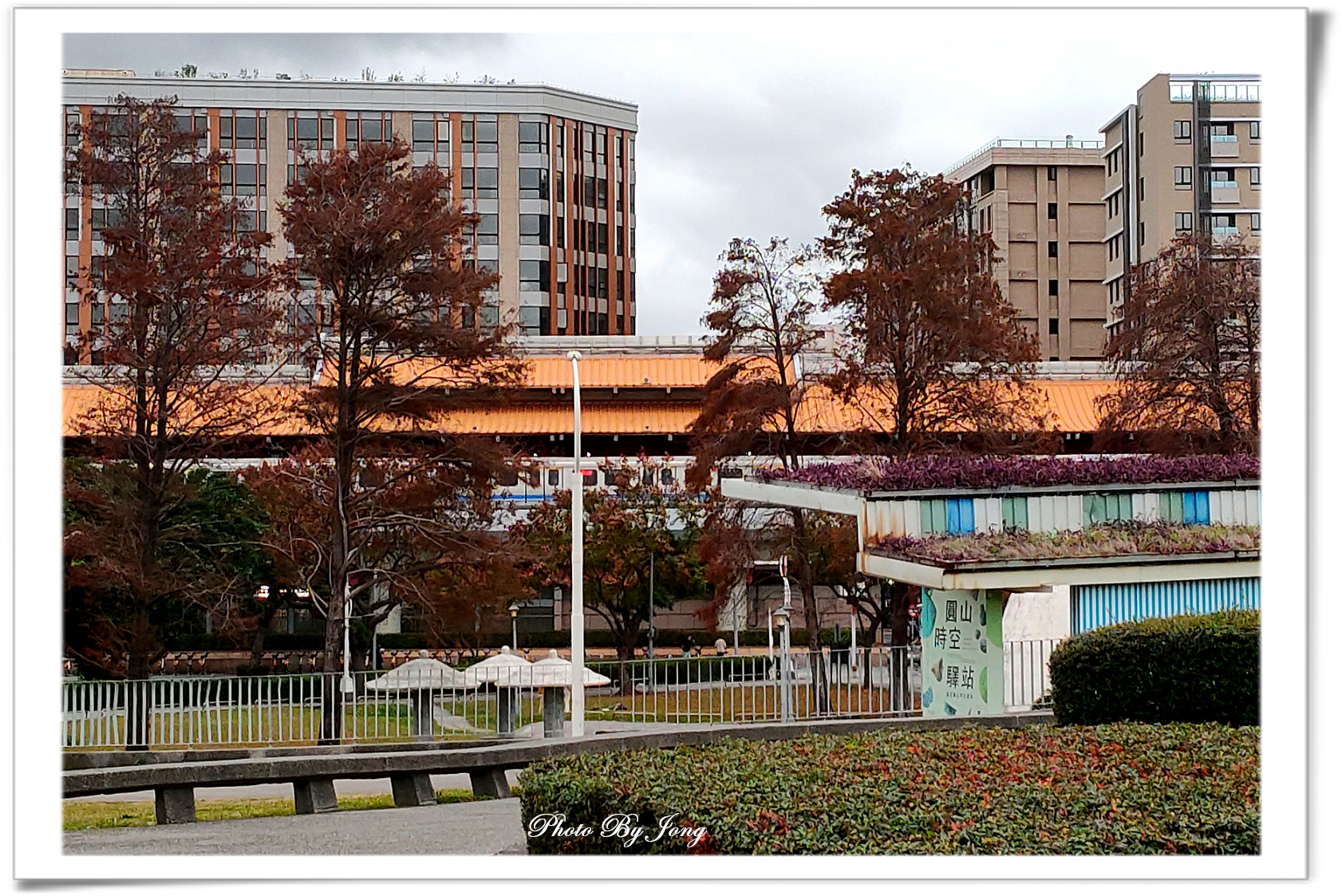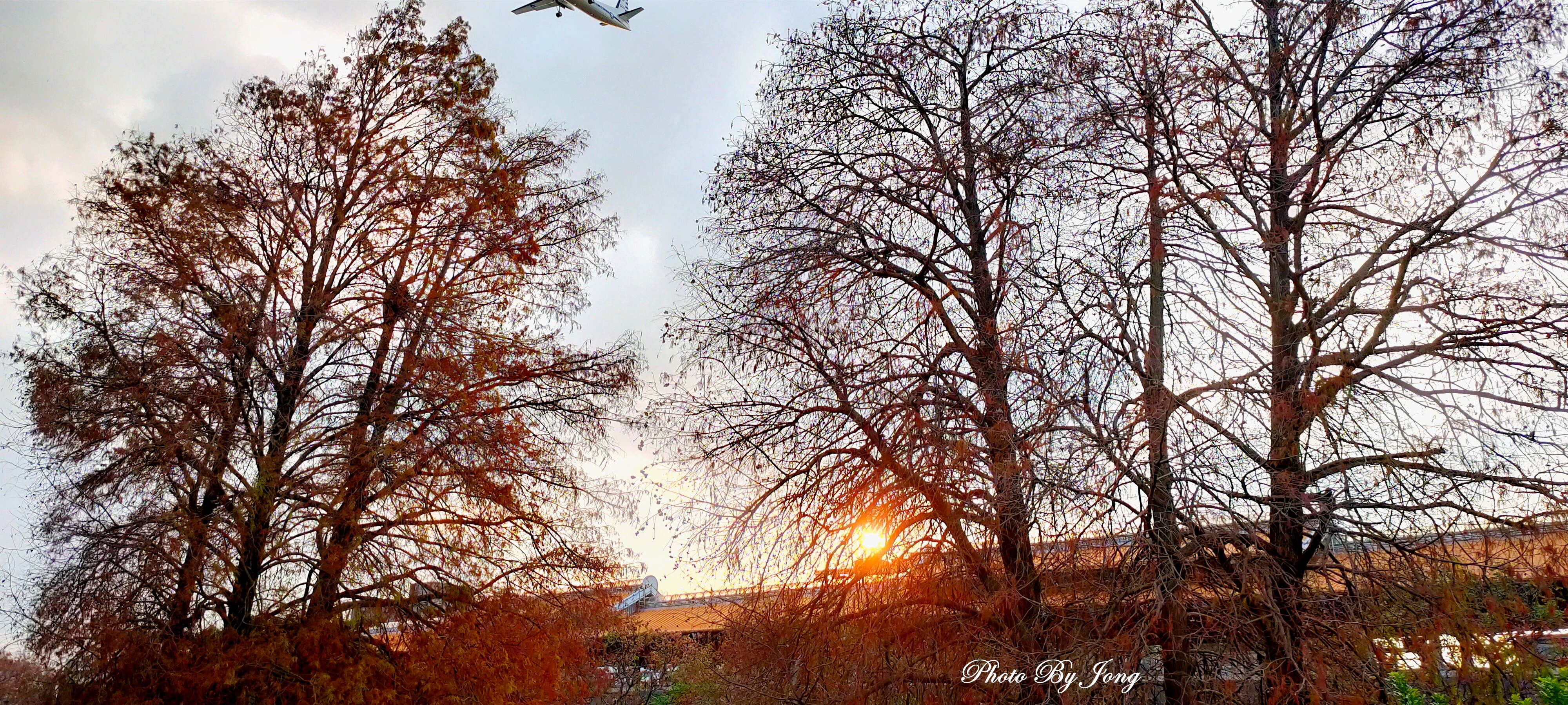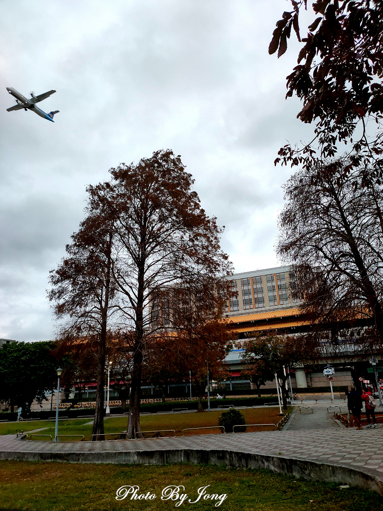 落羽松葉紅枝枯+蒼鷺+紅尾伯勞+台灣藍鵲+黑領椋鳥+紅嘴黑鵯。 就仿馬致遠《天淨沙》的詞的格式,以台北園區所見落羽松的情境填一首詞以為誌。 <落羽松葉紅枝枯鳥雀> 葉紅落羽雀鳥,橋欄水域園椅;步道和風遊客。 斜陽送暖,有情人結伴行。
