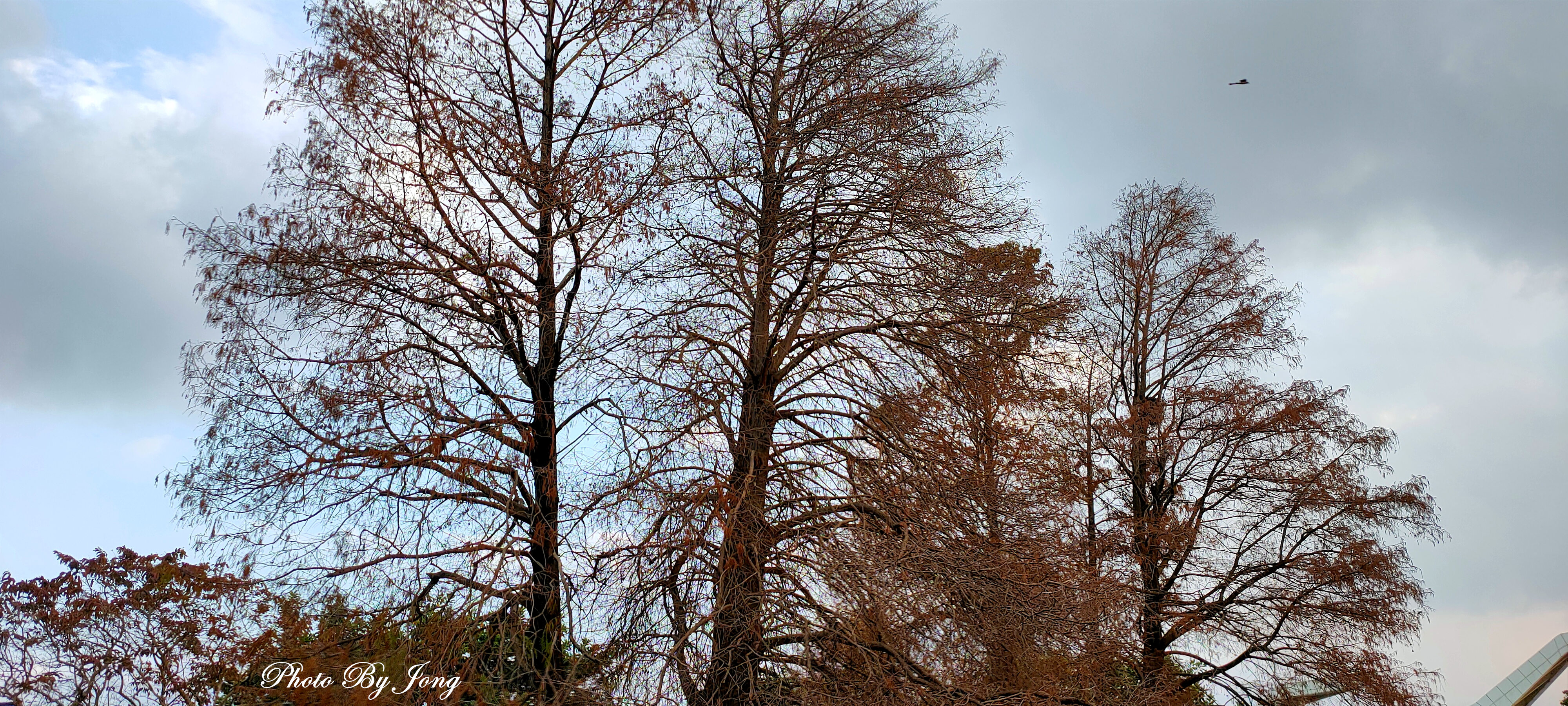 在都會的公園裡,無論是秋冬葉子轉紅落盡或是春來葉子發新芽滿樹青綠的落羽松,似乎頗受到鳥雀的青睞。
