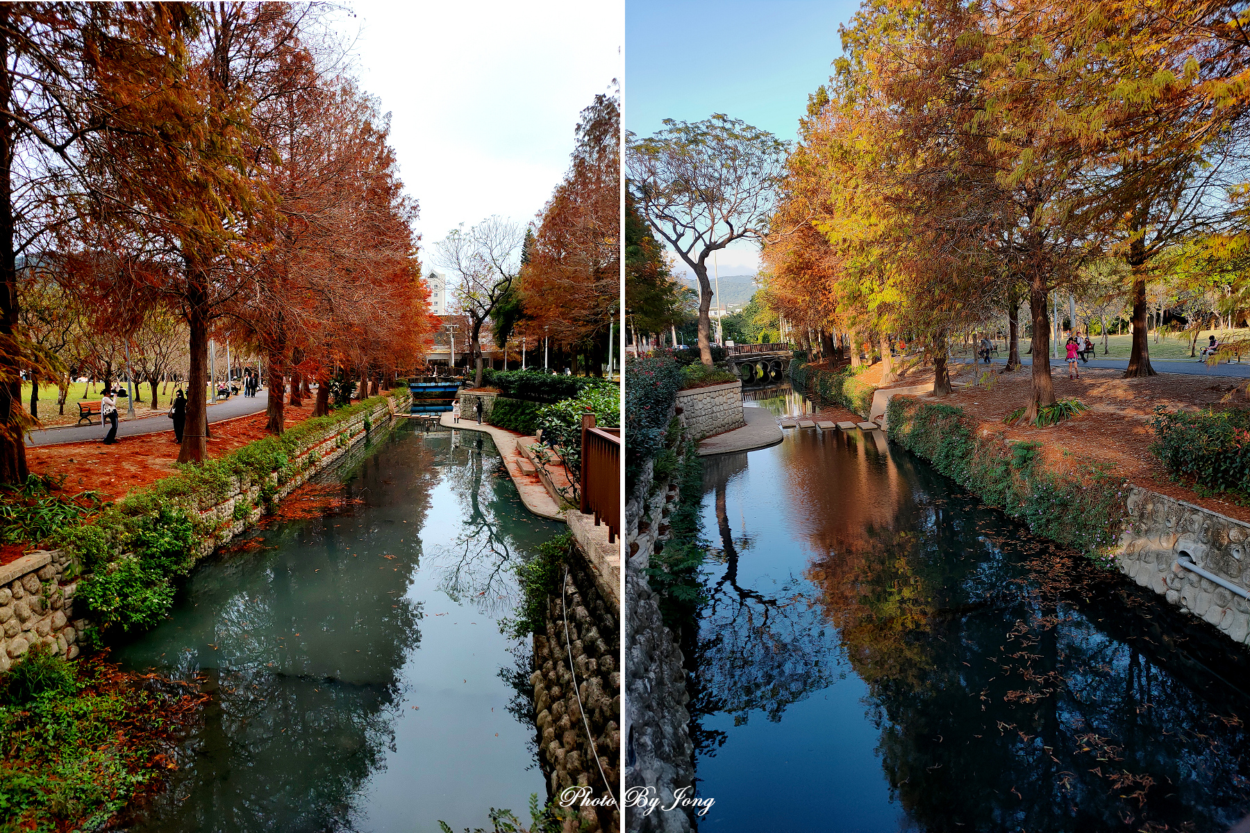 台北士林官邸河渠旁及周邊巷子的落羽松,入冬葉轉紅(部份仍綠),形成美麗的風景。 事實上,園區裡同樣的落羽松,往往就在同一處相鄰的位置,呈現的風貌,也往往並不相同。即使有的落羽松全身羽葉早已脫得精光,同時節,另一株卻依然全身綠葉茂盛。讓未長期觀察的來客,分不清究竟是已提早換裝了呢?還是某一株落羽松「天賦異秉」,無視於天氣的變化,依然精氣神俱足呢?這種同「樹」不同命,落葉、開花、結果有先後不同的現象,似乎世間其他各領域也所在多有,就像人也是「一樣米養百樣人」;十個指頭伸出來,也不一樣齊啊!