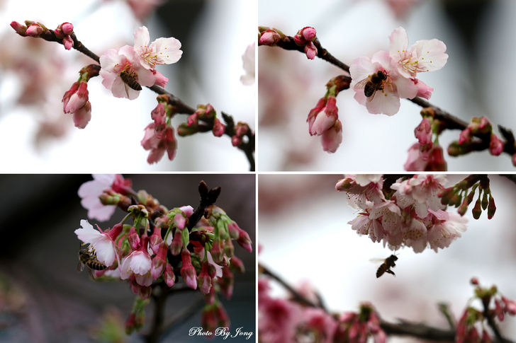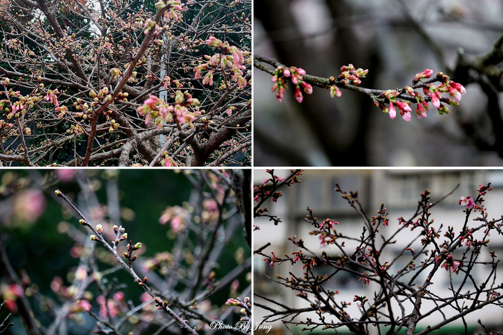 後記3—2/3往內湖樂活公園賞2026樂活公園夜櫻季(1/30~2/22舉行),寒櫻(第一區)多含苞待放,約僅初開一至二成、八重櫻(第二區)幾乎全為含苞狀態。看來愈接近過農曆年期間會開得愈盛吧。幸而仍有早開的寒櫻供遊人合影,花苞枯枝間也有拍到偶現的白頭翁、綠繡眼及提早開工的蜜蜂。