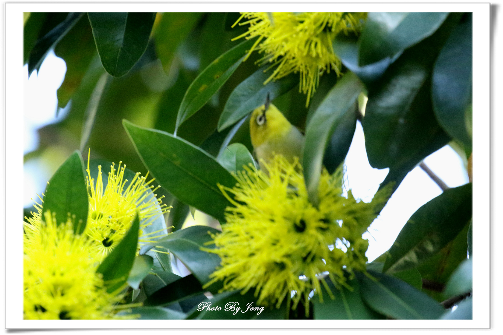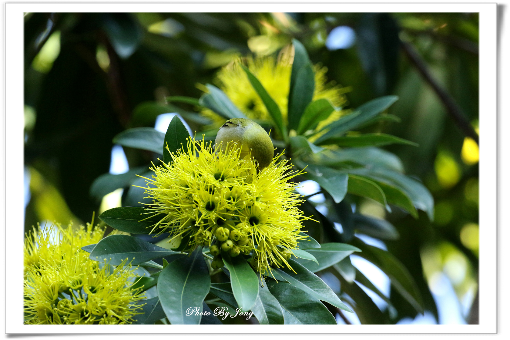 蒲桃果子又叫香果;落果松鼠來食(士林官邸、台大校園)。黃金蒲桃花團錦簇+綠繡眼+黃腳虎頭蜂(台北植物園、士林官邸)。 凡事有一就有二。後來,陸續到植物園、台灣大學也碰到了標示為蒲桃的香果樹。還巧遇到花兒吸引了蜂、蝶的圍繞以及落果松鼠來食的機緣。 另外,值得一提的,是士林官邸的主題園區旁,還栽了一排桃金孃科黃蕊樹屬的黃金蒲桃,花期全年,但盛花期約每年11月到次年2月,如逢士林官邸菊花展期正好開花,花團錦簇,同樣吸晴;有一說,遠看仿佛一個個憨態可愛的熊貓臉,因此又有「金黃熊貓」的別名,是花色特殊的珍奇花木。