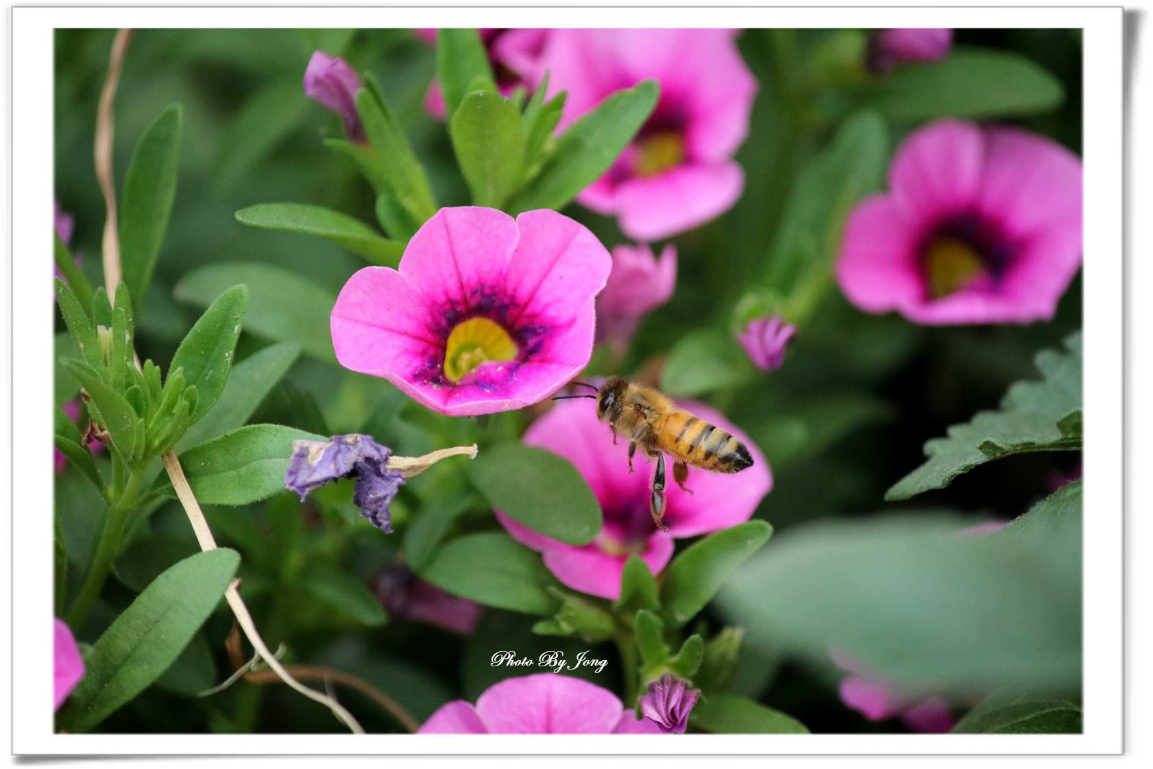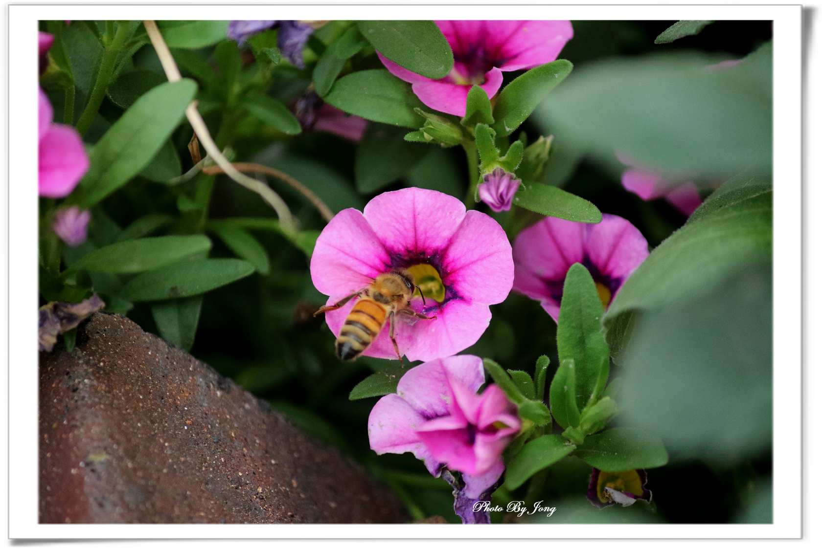 夢幻草+西洋蜂。 夢幻草 ‧科名:毛茛科(Ranunculaceae)耬斗菜屬(Aguilegia) ‧別名:樓斗菜、漏斗花、耬斗菜、駱駝菜、獅子草、聖母的手套、血見愁、耬斗花、西洋耬斗菜、西洋小田卷(日本) ‧原產地:北半球各地,歐洲,南非 ‧分布:園藝栽培 ‧用途:1.園藝庭園觀賞用:因葉形優美、花姿獨特,可從植於花壇、花徑、岩石園、林緣或疏林下。盆植、花壇、切花均適宜。2.藥用:全草藥用,能調經止血、清熱解毒。主治月經不調、功能性子宮出血、痢疾、呼吸道炎症。 ‧花:單歧聚繖花序頂生和腋生;萼片 5,卵形或狹卵形,背面疏被柔毛。花瓣 5,倒三角狀矩圓形,長約 6 公分,距稍內彎;雄蕊多數,花絲線形,花藥先端尖;退化雄蕊條狀披針形;心皮 5,密被腺毛或柔毛。花色有紅、紫、黃等。 (相關資料取材自莊溪<認識植物>網誌)