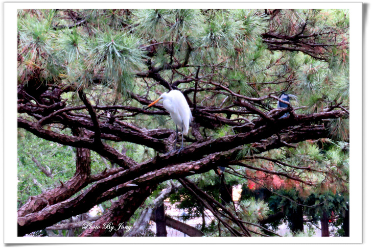 松+白粉蝶飛+褐斑蜻蜓+紫紅蜻蜓+夜鷺捕魚(雙溪公園)。 詩人與松的互動,詩中有松、夕陽、月、鳥、風、雨、泉、琴、舟等元素。 巧的是,在台北中正紀念堂雲漢池中的小島,似乎在地理環境上正營造出了老松、鳥、泉等元素,至於風、月、琴、舟等天時、人和的氛圍,則有賴觀者自行去感受和把握了。 多次的巡禮,我發現雲漢池中小島上的這棵老松樹,確實頗受各種鳥兒喜愛棲息。陸續發現的鳥兒除了習見的城市三俠白頭翁、綠繡眼、麻雀外,還有金背鳩、紅鳩、鴿子、鵲鴝(四喜)、喜鵲、樹鵲、台灣藍鵲、輝椋鳥、蒼鷺、小白鷺、大卷尾、紅嘴黑鵯,還可見到白腹鶇、赤腹鶇、翠鳥等。