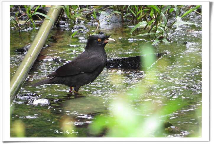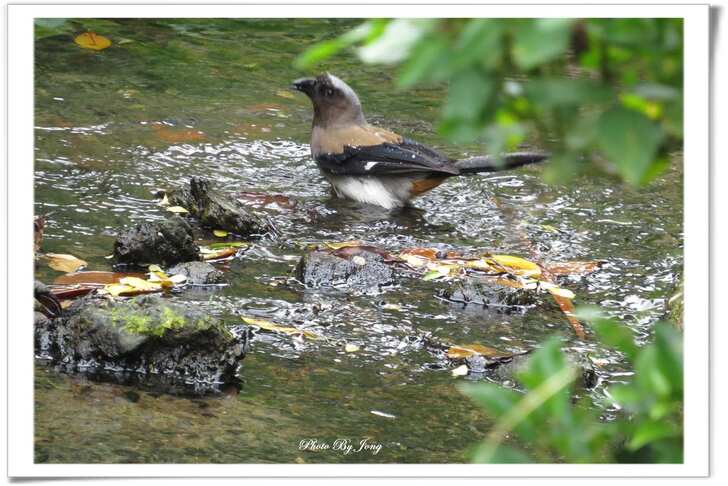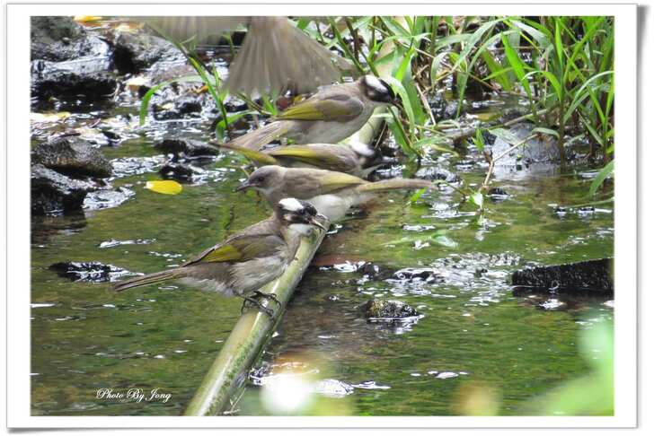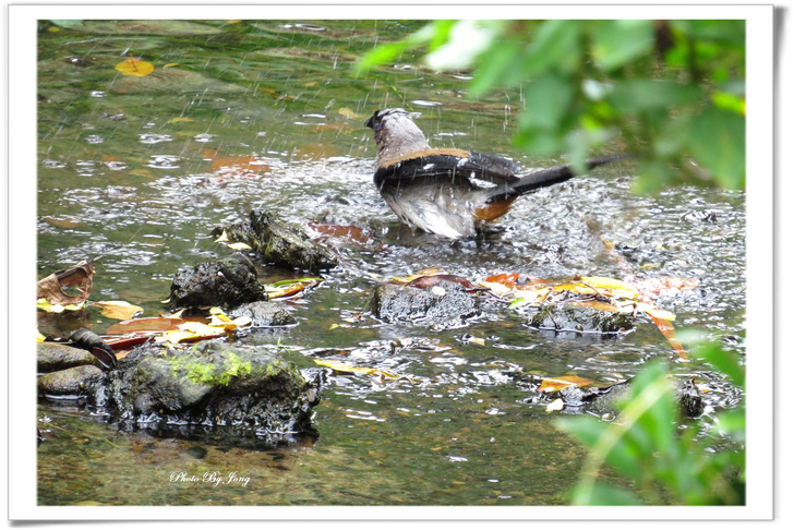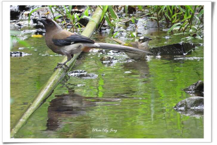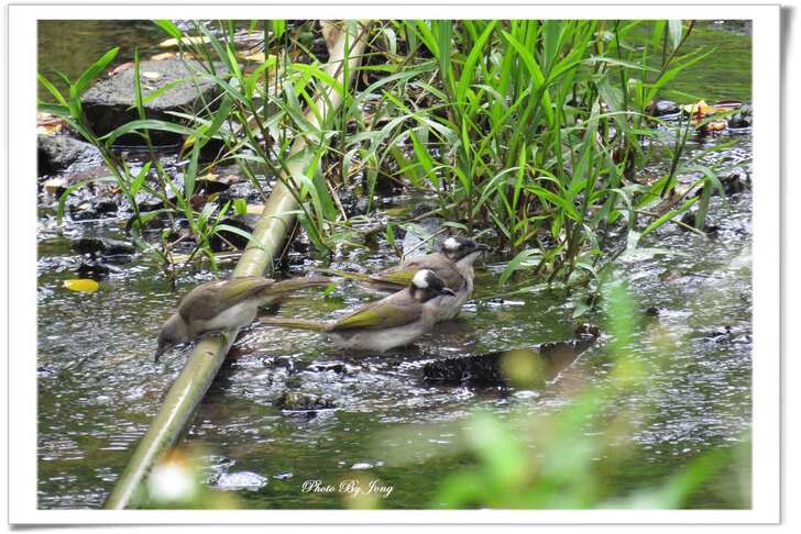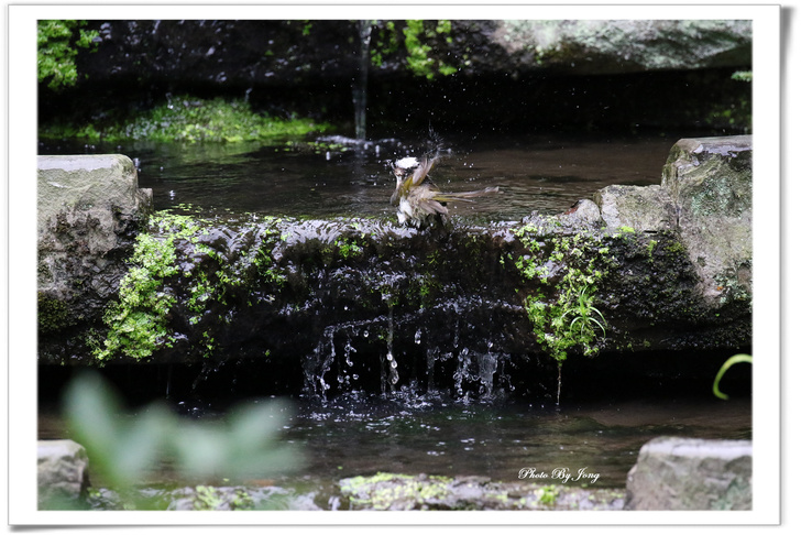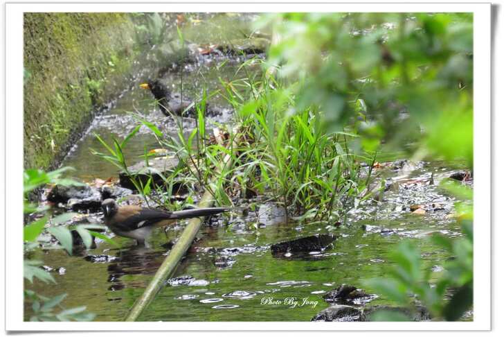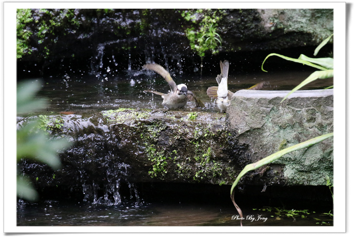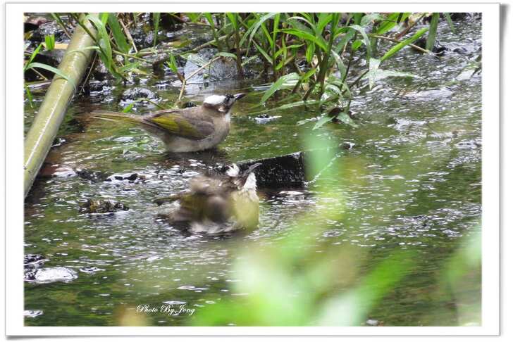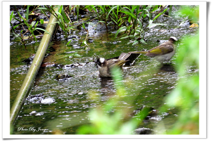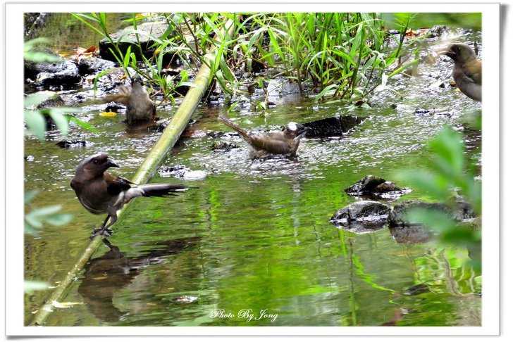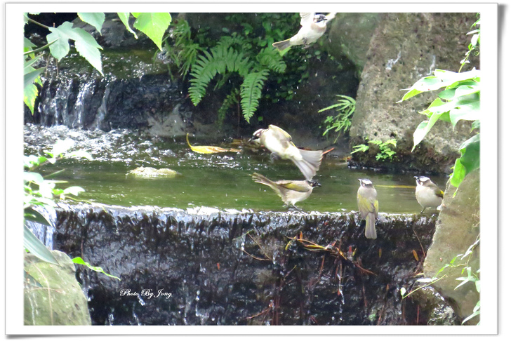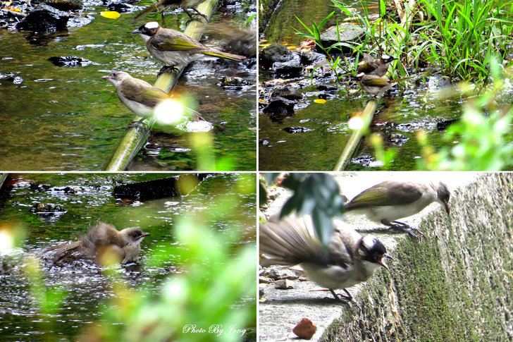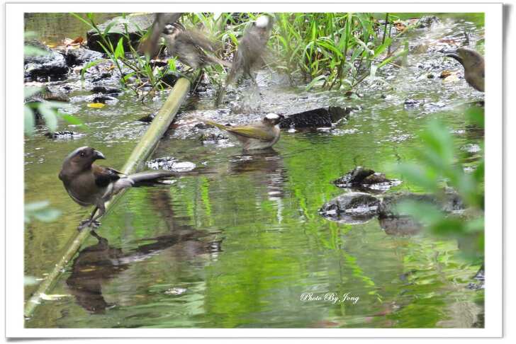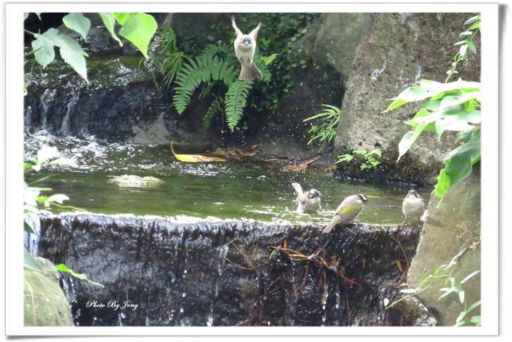 來入浴的鳥兒還真不少,白頭翁成群及樹鵲結伴消暑樂。 在陽明山拍台灣藍鵲活動,有一次碰到一位遊園的朋友,閒聊起來,知道他是專程從台中來台北遊,且特別趕來陽明山前山公園男湯洗免費的溫泉浴。我開玩笑說,可否也隨同前往拍幾張出浴圖來做報導介紹呢?他立刻正色不悅的表示,千萬不可,是會觸犯個人隱私權的。 幸好,我的目標是以鳥兒為主角,鳥兒出浴雖也會避人耳目,但若是被人不小心發現拍到,應該無法提出侵犯肖像隱私權的抗議,也就不會有觸犯隱私權的問題。因為鳥兒混身羽毛,即使出浴水浸全身,也只能讓觀者看到沾溼的羽毛外衣,看不到裸裎相見的畫面哦!