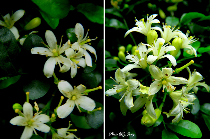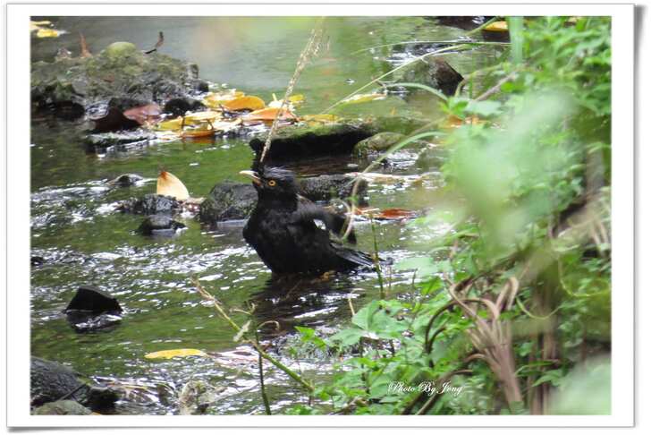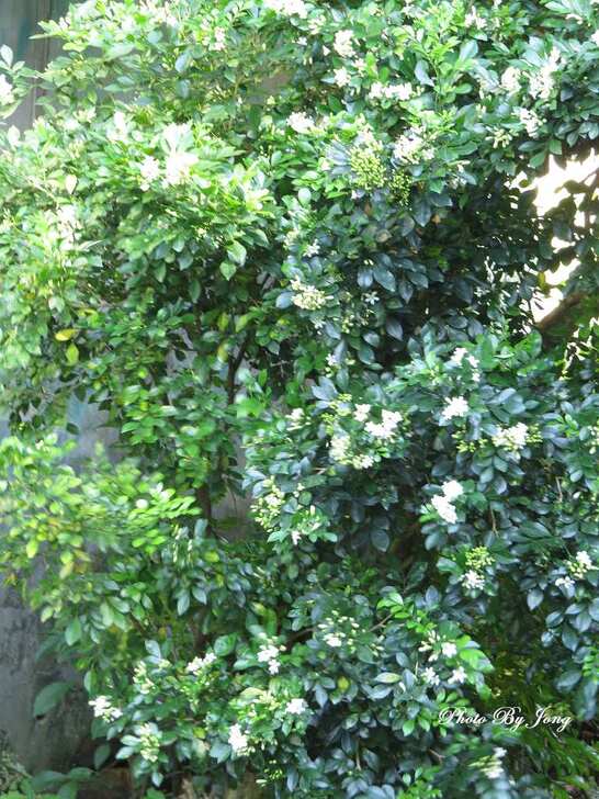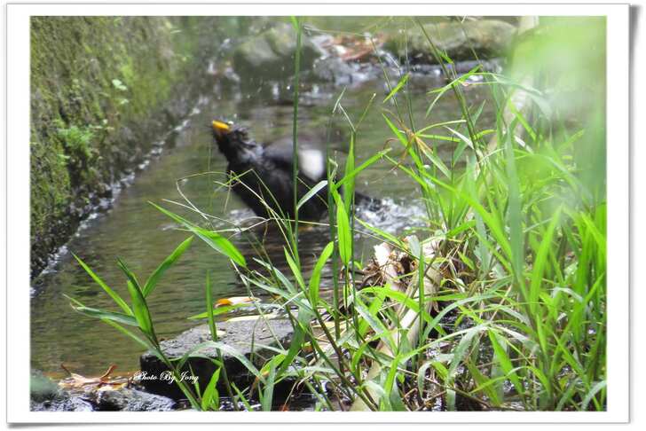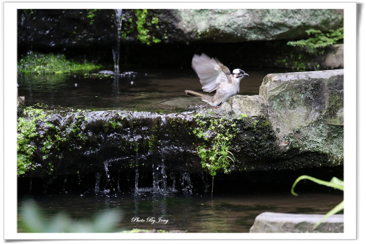 來入浴的鳥兒不少,白頭翁、本土八哥、白尾八哥、樹鵲顯然都是造訪的常客。 若非夏日炎炎,暑熱難耐,鳥兒怎會選擇池水溪流,將全身浸泡入水中,打溼了飛翔配備的羽衣?豈不明白是如人們夏日愛泡在泳池溪流中,為了消除酷熱暑氣,樂在其中嗎!見鳥之樂,我們也分享了一份快樂了吧。 在士林官邸的一處小溪溝中,我不經意的發現了一處鳥兒出浴的秘密空間,隱在幾株大樹及春不老灌木叢遮閉的圍籬的後面。這兒幽靜且避開了惡毒的烈陽照射,妙的是,小溪溝的另一邊正好是一戶人家紅磚的圍籬,還栽有一棵高大開滿了白色小花的月橘(又名七里香、千里香),可以感覺周遭必然散發著花兒特有的芬芳吧,眾鳥兒就選擇了這花叢做為飛躍下方小溪溝入浴的停憩處,還真讓人叫絕!