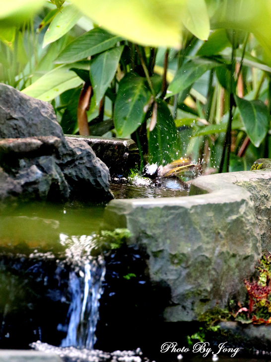 如同莊子見到魚游水中有感:「鯈(ㄔㄡˊ)魚出游從容,是魚之樂也。」我見到鳥兒夏日在池水中出浴,也會有感:「雀鳥出浴暢快,是鳥之樂也。」 在士林官邸的一處小溪溝中,我不經意的發現了一處鳥兒出浴的秘密空間,隱在幾株大樹及春不老灌木叢遮閉的圍籬的後面。