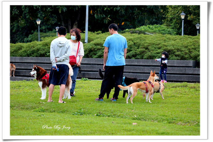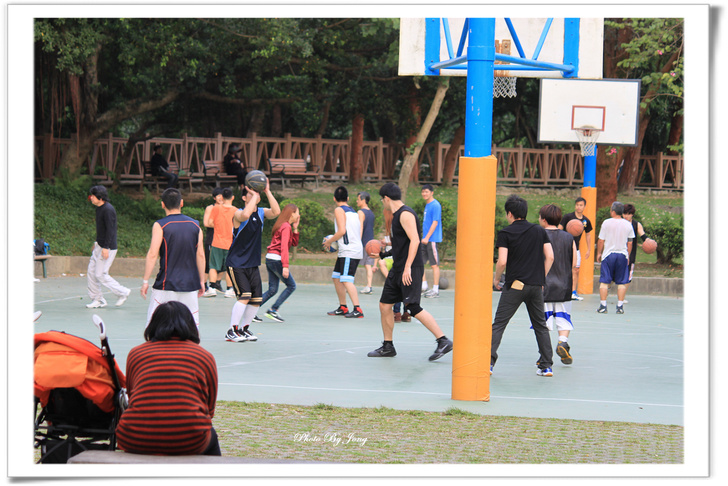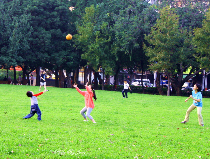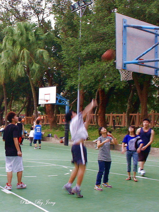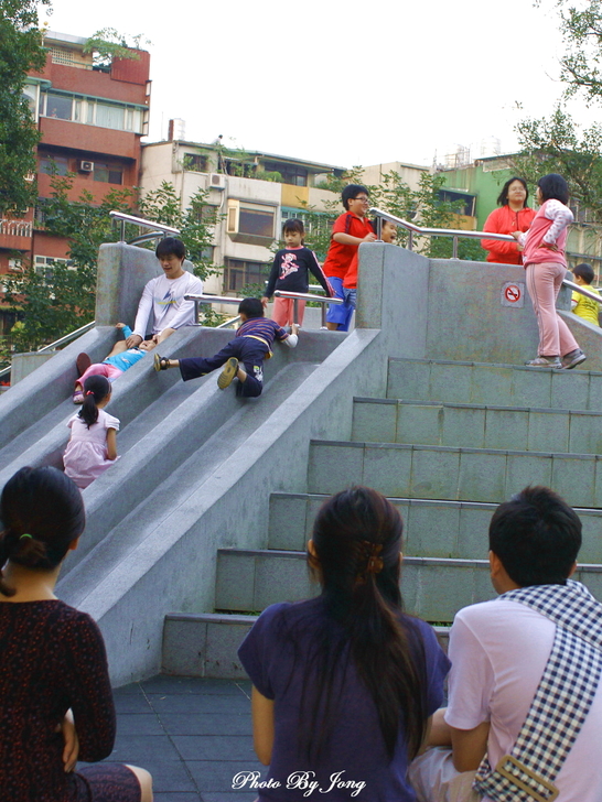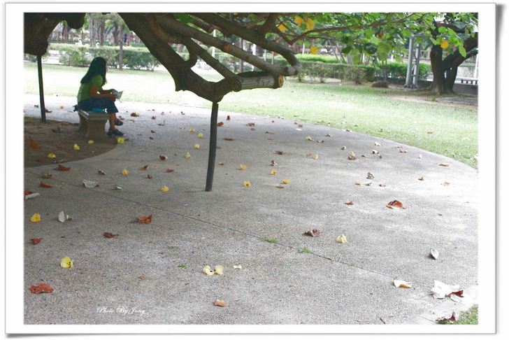 樹下靜坐,享受片刻的寧靜! 假日的午後,台北的天空仍然是灰濛濛的,信步走來每日黃昏後都會來散步的公園。白天的公園與傍晚天色大暗後的寂靜情景大不相同了,顯得格外生氣蓬勃,各式各樣正在進行的活動相當多。 一路上,碰到許多牽著打扮入時的狗兒溜狗的主人,一片綠意的草坪上,有好些人在玩拋接球、擲棒球;籃球場上也不時傳來吆喝叫好聲,有好幾隊正在拚鬥的年輕人,捉隊廝殺得難分難解;還有遊樂場上,嬉鬧的兒童及一旁守候的家長們,以及悠閒漫步的老老少少。