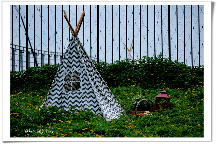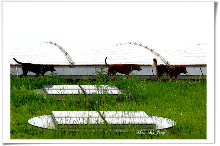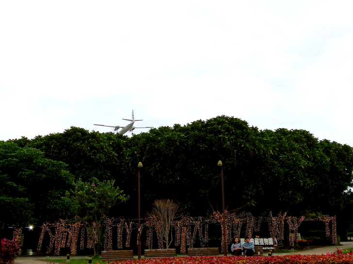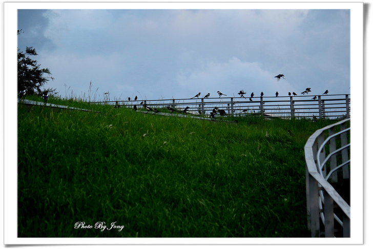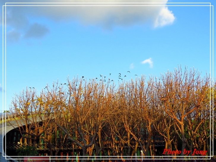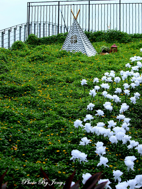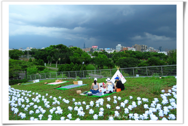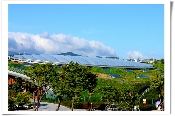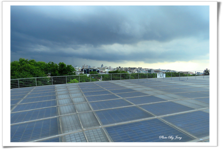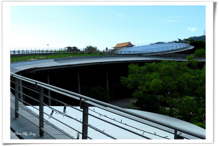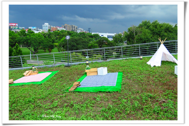 「天空步道」曾規畫為生活露營賞星空區,遺憾的是很快就又再關閉了。 新生園區在花博期間還有一項頗受青睞的項目就是「天空步道」,正是在天使館、未來館及夢想館的頂樓,花博期間因控管人數,排隊人潮綿長,個人也希望花博後能有機會登頂,可惜,展後,有關單位為了屋頂的養護及安全,就一直關閉迄今。早些年,終於因為有廠商願意承租營業,規畫為生活露營賞星空區,醞釀開放,眼看將會是使用者付費來控管了。然而,遺憾的是試營運不多時,或未如預期,很快就又再關閉了。 其實,就在未來館及天使館這棟建築外圍(現改為「台北典藏植物園」),就有第倫桃樹、櫻花及象牙木樹組成的幾個園林區塊。建築屋頂周邊的圍欄,則是松機下降必飛過以及喜鵲等鳥愛聚集停憩的場域。