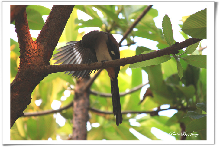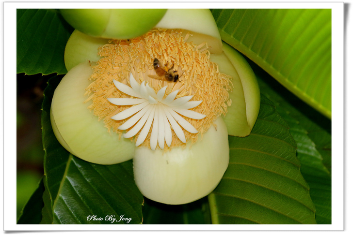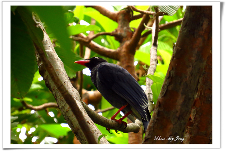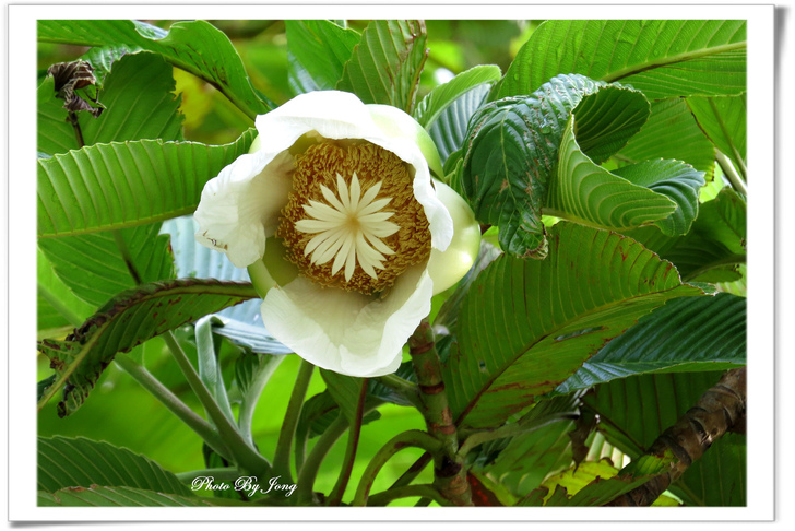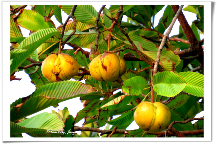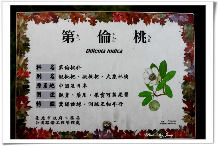 新生公園第倫桃在炎熱的七月竟見全株落葉換新葉,鳥棲飛(大卷尾、白尾八哥、家八哥、黑領椋鳥、喜鵲、白頭翁)、機降飛掠讓人印象深刻。 第倫桃 ‧英文名稱:Indian Dillenia,Hondapara ‧學名:Dillenia indica Linn. ‧科別:第倫桃科(Dilleniaceae)第倫桃屬(Dillenia) ‧別名:第倫桃,擬枇杷、假枇杷、五椏果(中國大陸) ‧原產地:中國雲南省、印度、馬來西亞、爪哇、菲律賓 ‧特徵:常綠喬木高 25 公尺,胸徑寬約 1 公尺,樹皮紅褐色,平滑,大塊薄片狀脫落,幹基部常有陡峭、直立的板根狀突起;嫩枝粗壯,有褐色柔毛,老枝禿淨,有明顯的葉柄痕跡。 葉薄革質,矩圓形或倒卵狀矩圓形,長15~40 公分,寬 7~14 公分,先端近於圓形,有長約 1 公分的短尖頭,基部廣楔形,不等側,上下兩面初時有柔毛,不久變禿淨,僅在背脈上有毛,側脈 25~56 對,幹後在上下兩面均突起,脈間相隔 0.5~0.8 公分;第二次支脈近於平行,與第一次側脈斜交,脈間相隔 0.2 公分,在下面與網脈均稍突起,邊緣有明顯鋸齒,齒尖銳利;葉柄長 5~7 公分,有狹窄的翅,基部稍擴大,多少被毛。